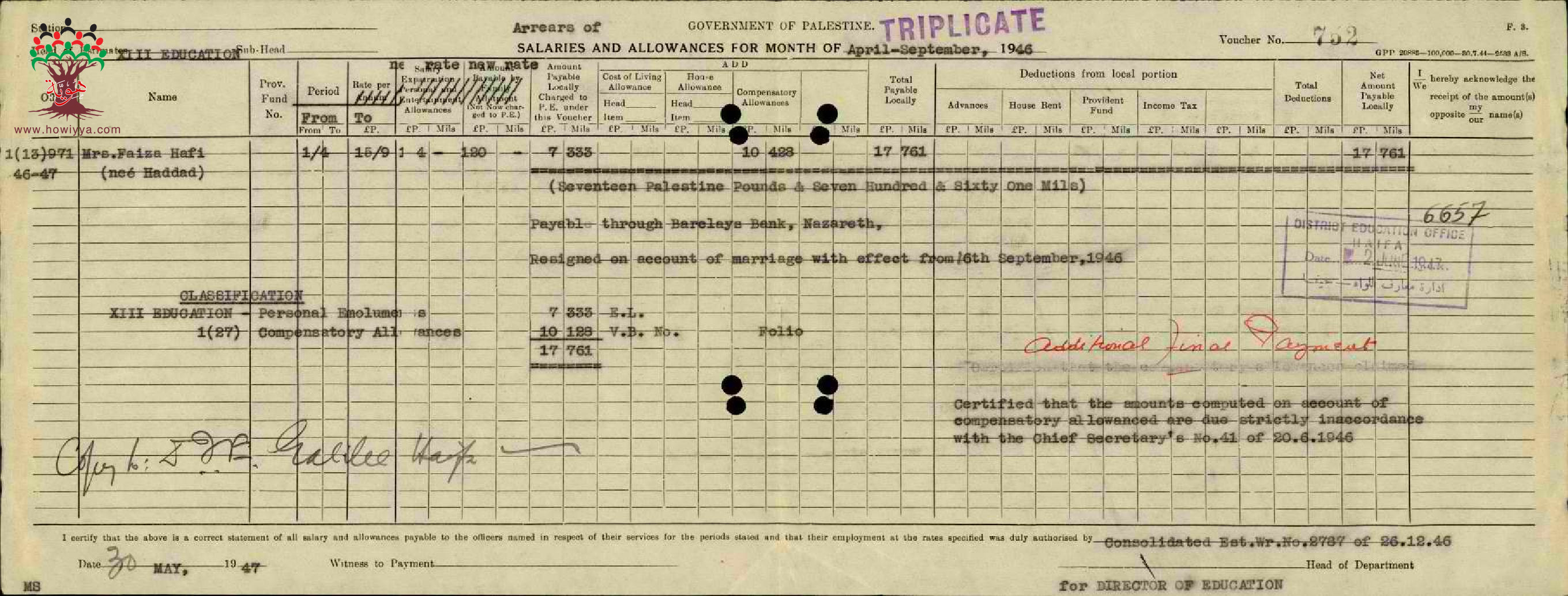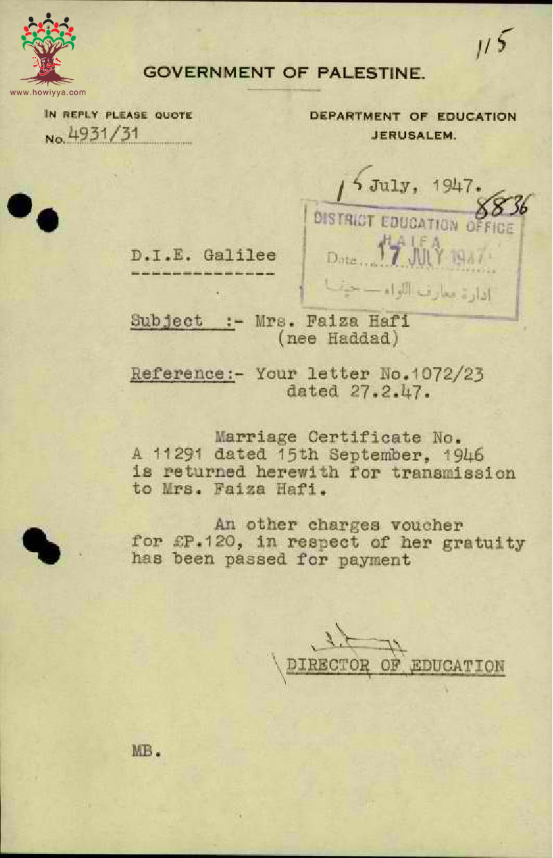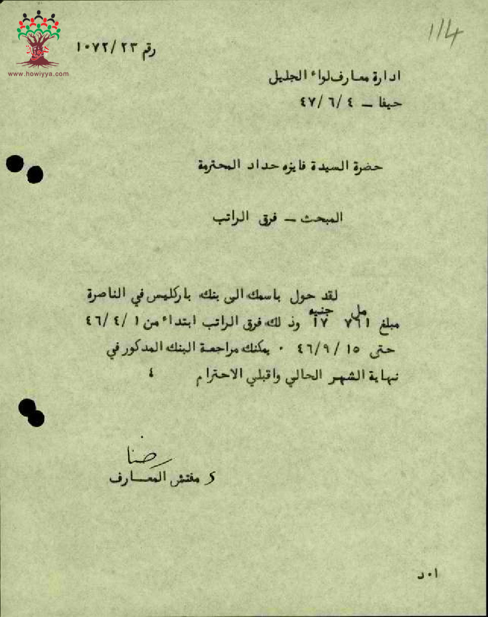 مجموعة رسائل وأوراق بخصوص تحويل اكرامية الزواج للمعلمة فايزة حداد الى بنك باركليس