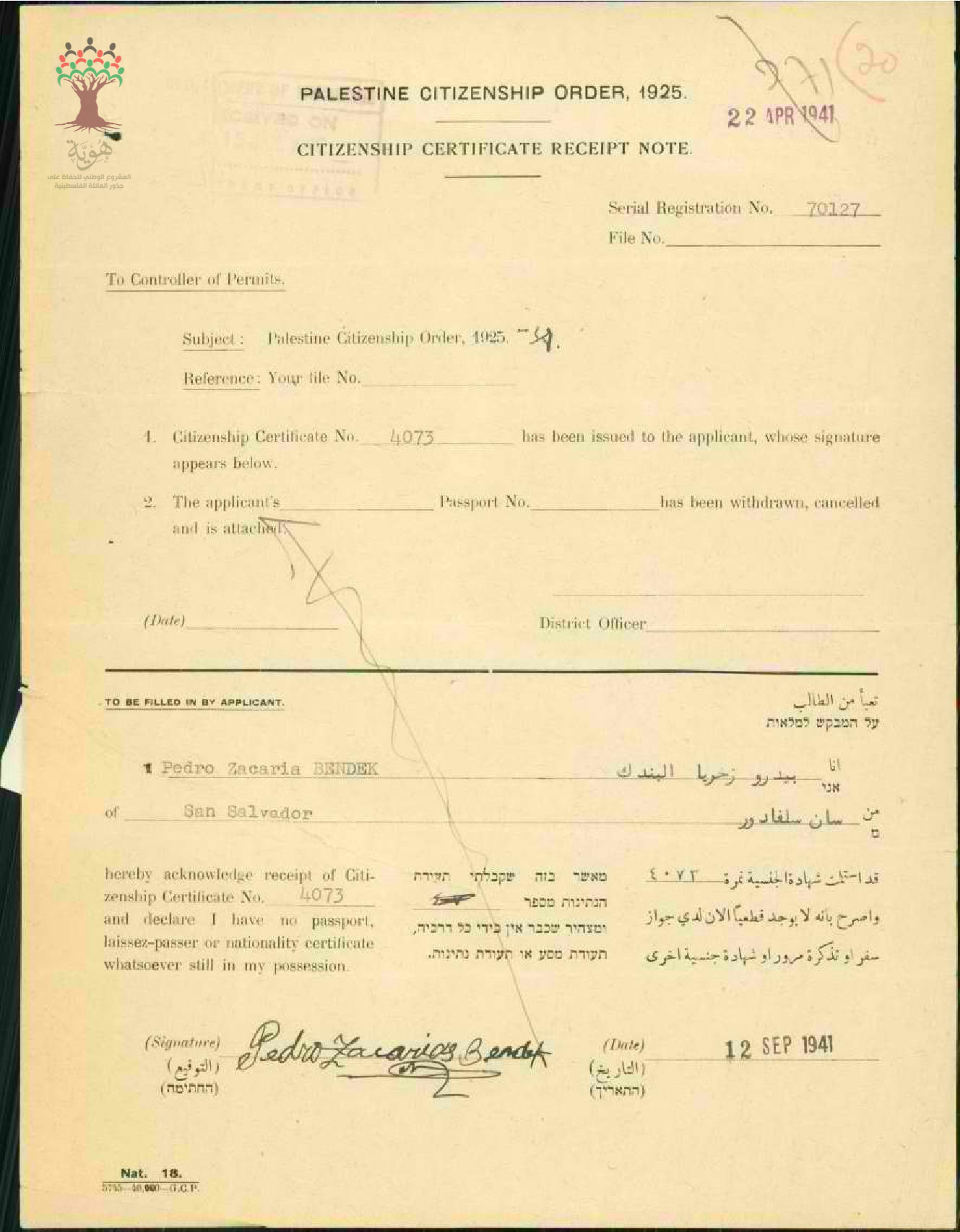 ايصال موقع من بدرو البندك باستلام الجنسية الفلسطينية