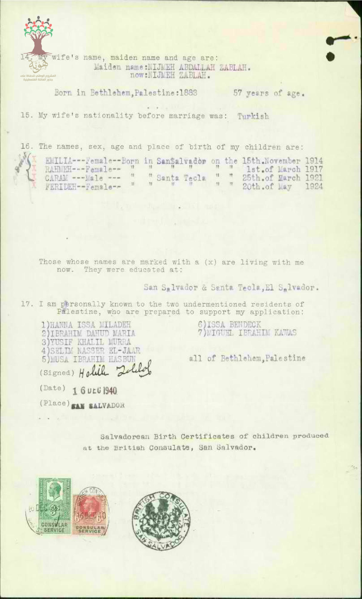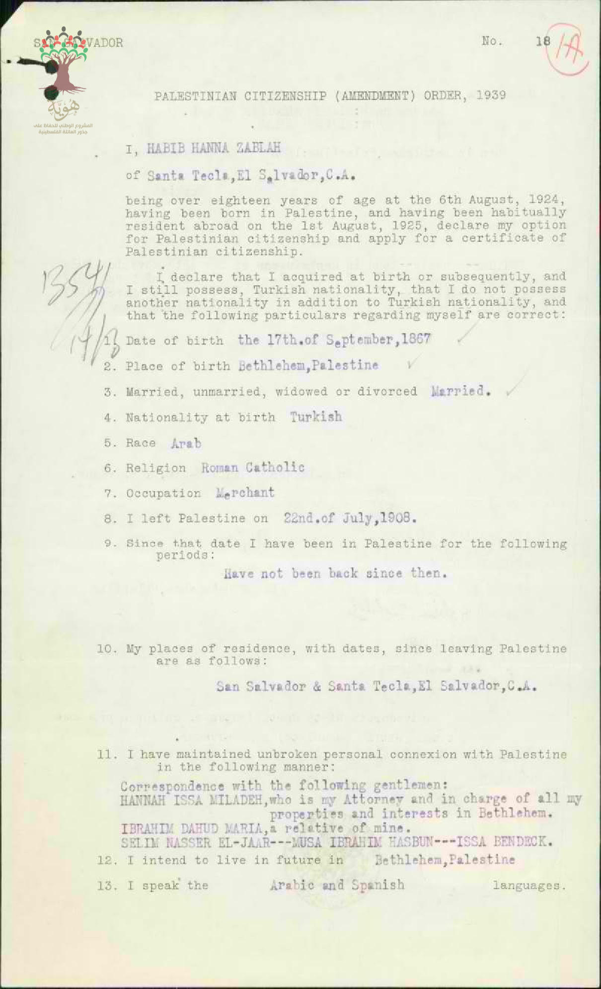 طلب الجنسية الفلسطينية-حبيب حنا زبلح-بيت لحم/السلفادور