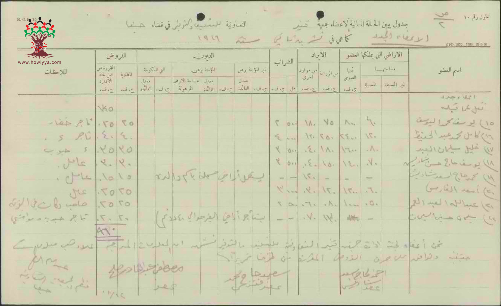 جدول يبين الحالة المالية لأعضاء جمعية قنير التعاونية للتسليف والتوفير لسنة 1946