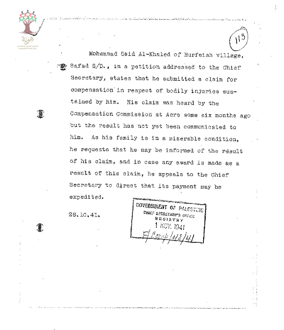 طلب تعويض مقدم من محمد الخالد الى السكرتير العام