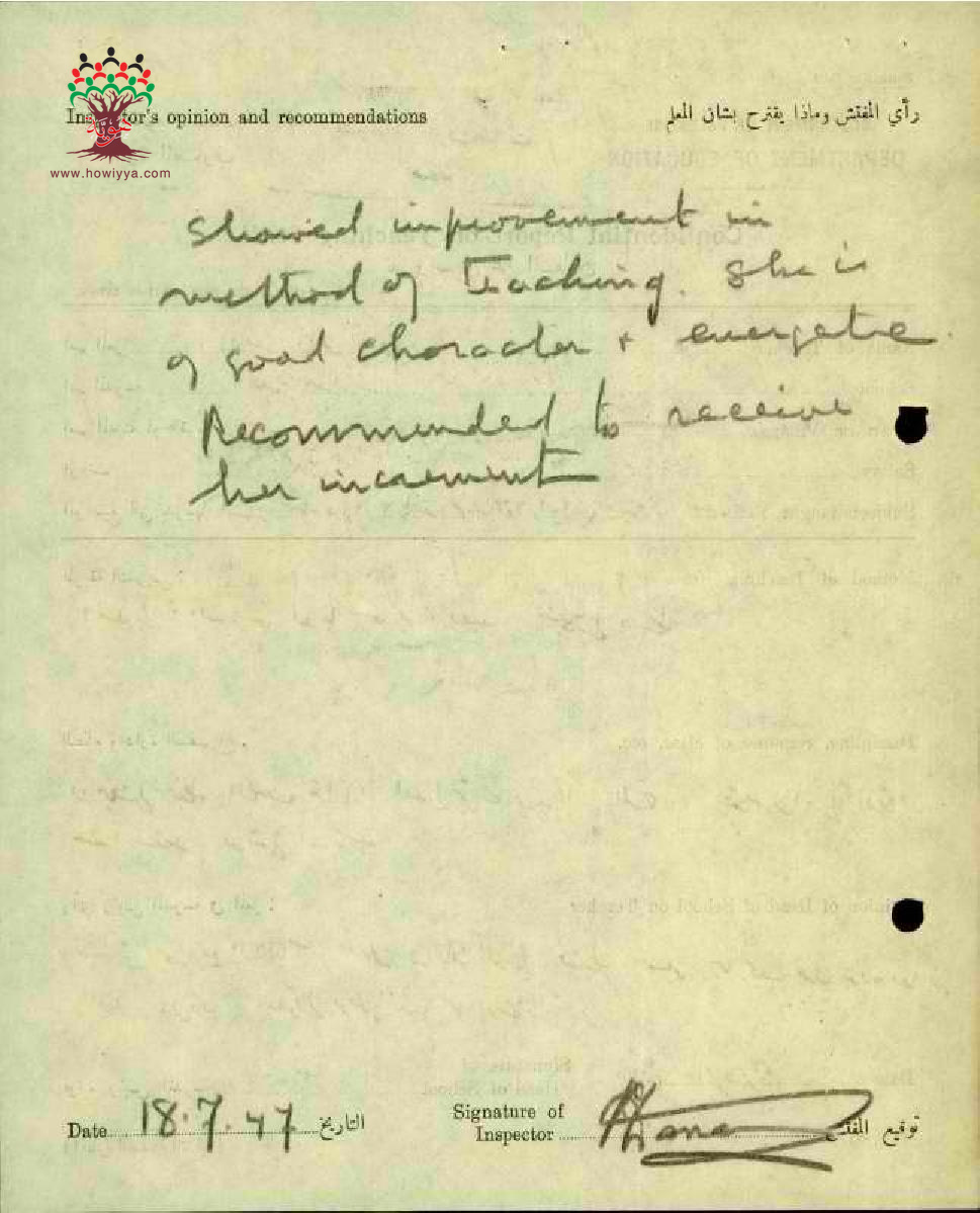 تقرير تفصيلي عن أداء المعلمة فاطمة غنيم في مدرسة بنات صفد سنة 1947