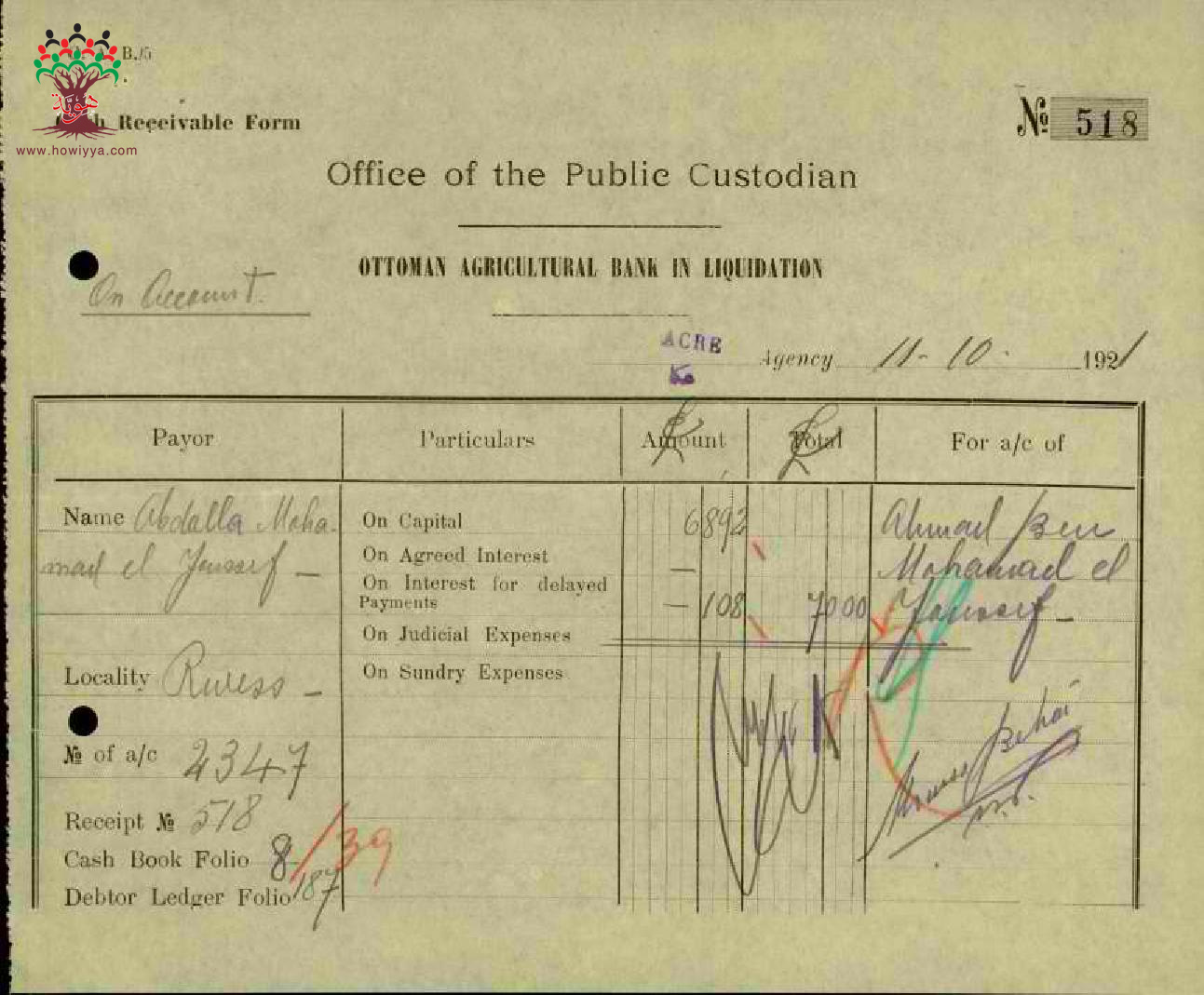 إيصال دفع قسط قرض للبنك الزراعي العثماني من عبد الله محمد اليوسف