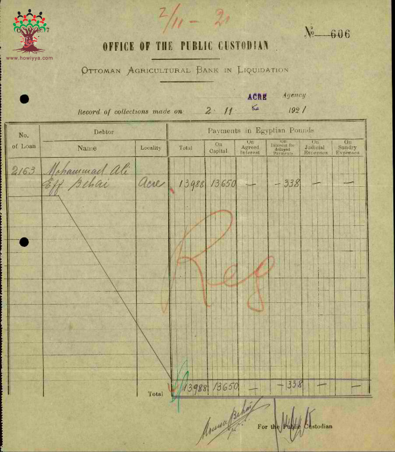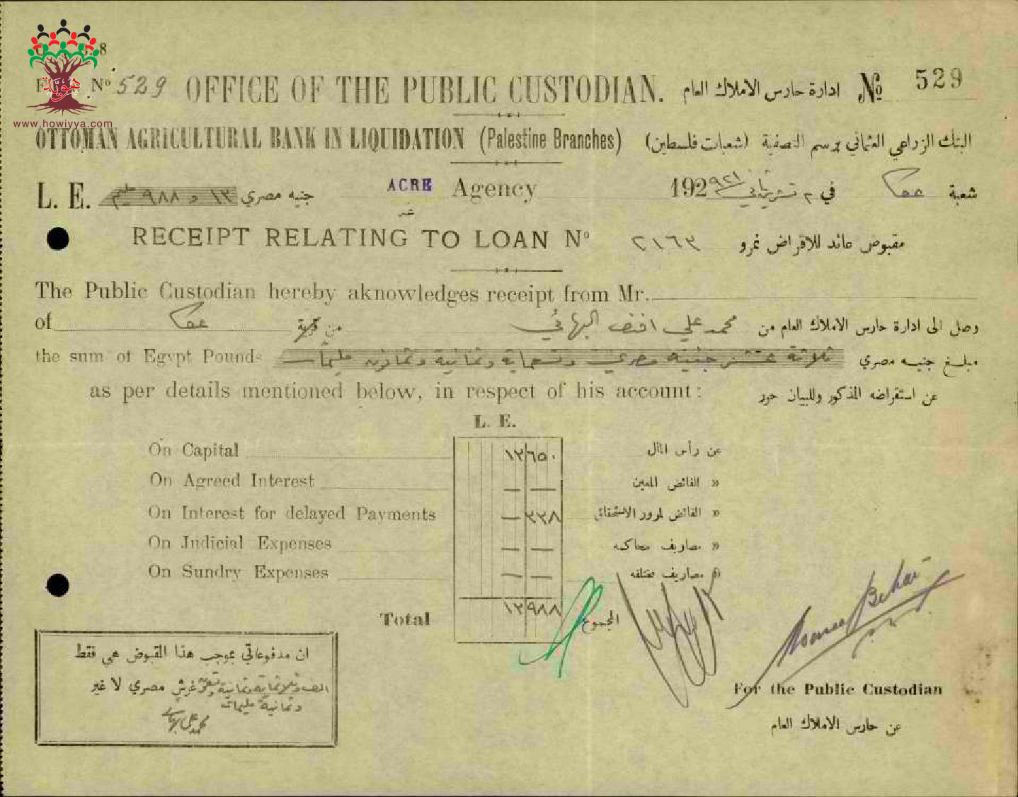إيصال دفع قسط قرض للبنك الزراعي العثماني من محمد علي البهائي