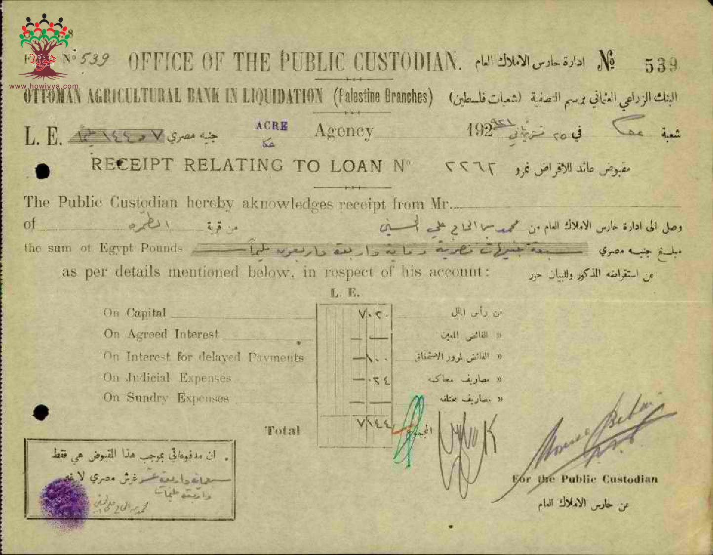 إيصال دفع قسط قرض للبنك الزراعي العثماني من محمد الحاج علي الحسيني