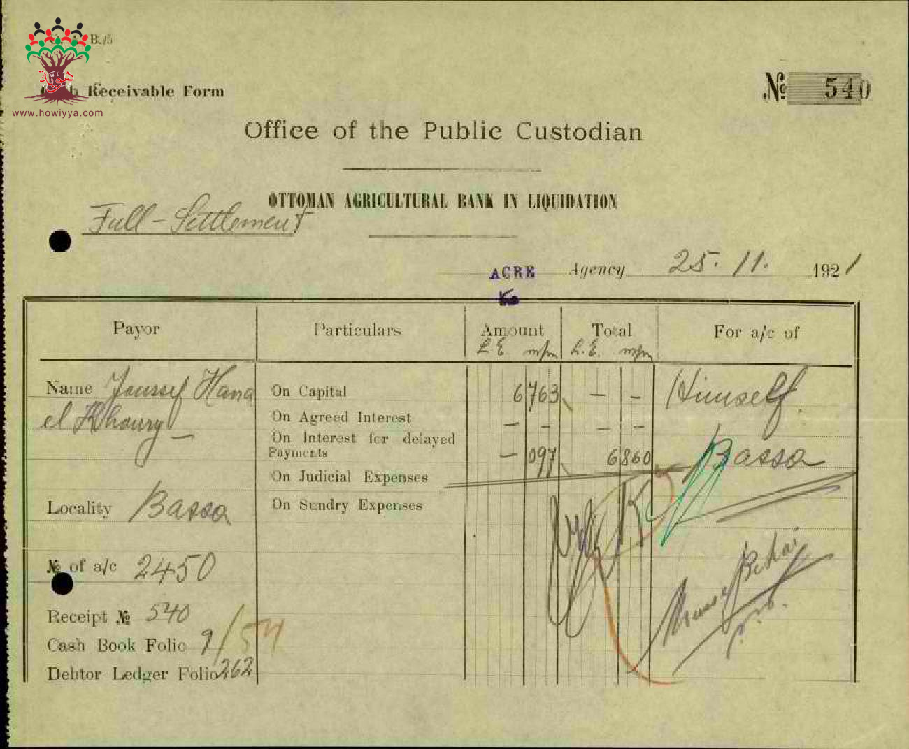 إيصال دفع قسط قرض للبنك الزراعي العثماني من يوسف حنا الخوري