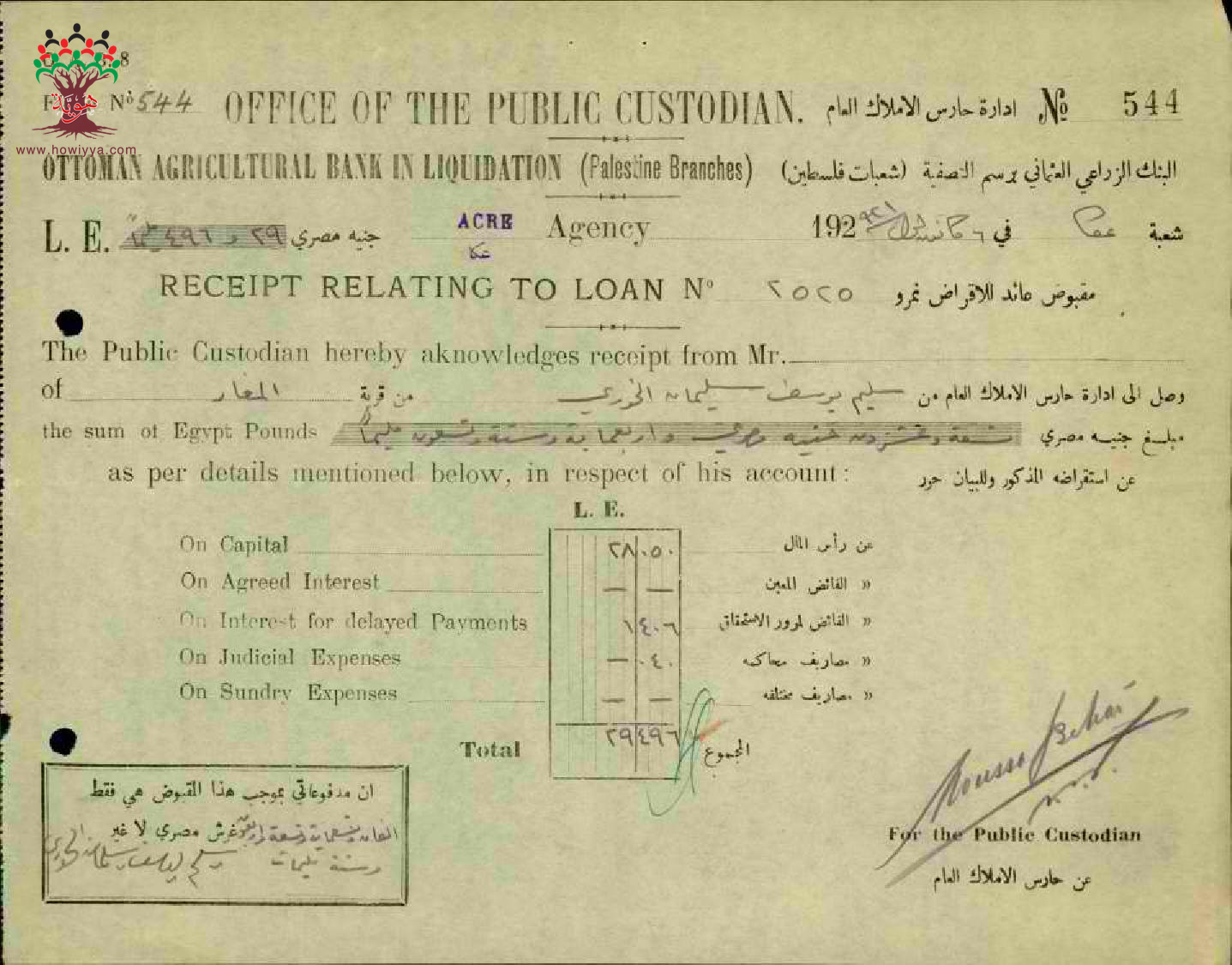 إيصال دفع قسط قرض للبنك الزراعي العثماني من سليم يوسف سليمان الخوري