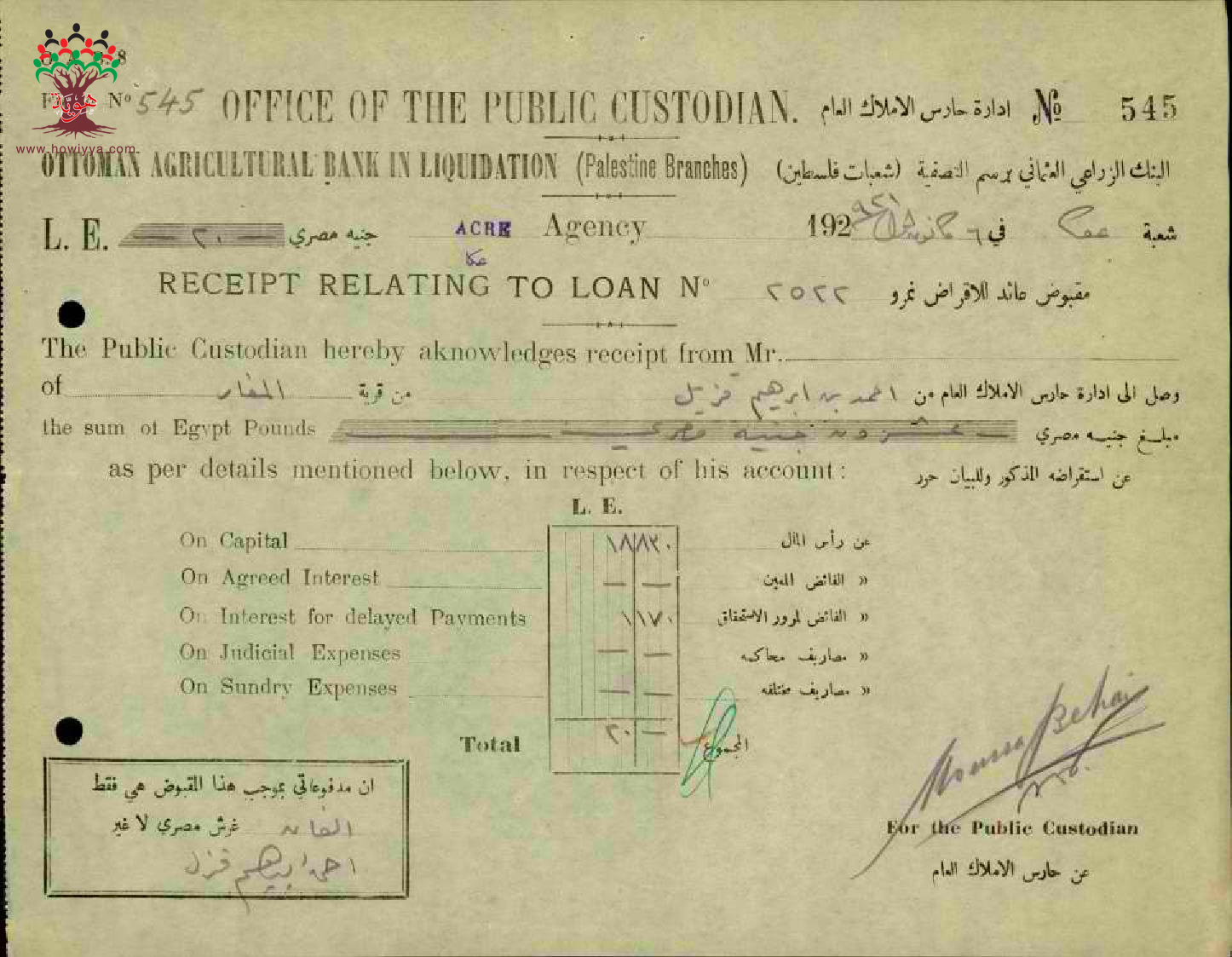 إيصال دفع قسط قرض للبنك الزراعي العثماني من أحمد ابراهيم قزيل