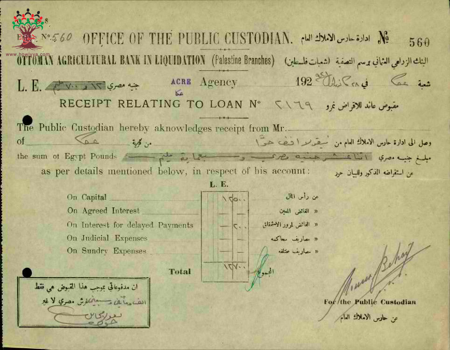 إيصال دفع قسط قرض للبنك الزراعي العثماني موقع من نقولا حوا