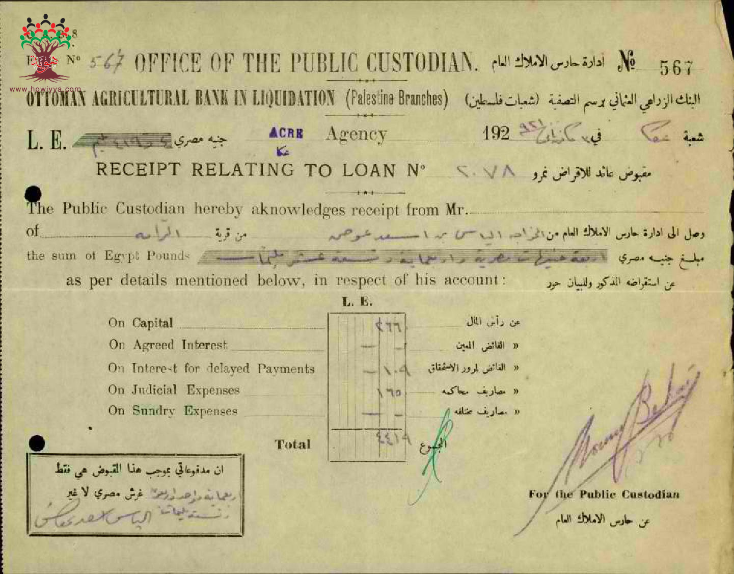 إيصال دفع قسط قرض للبنك الزراعي العثماني موقع من الياس أسعد عوض