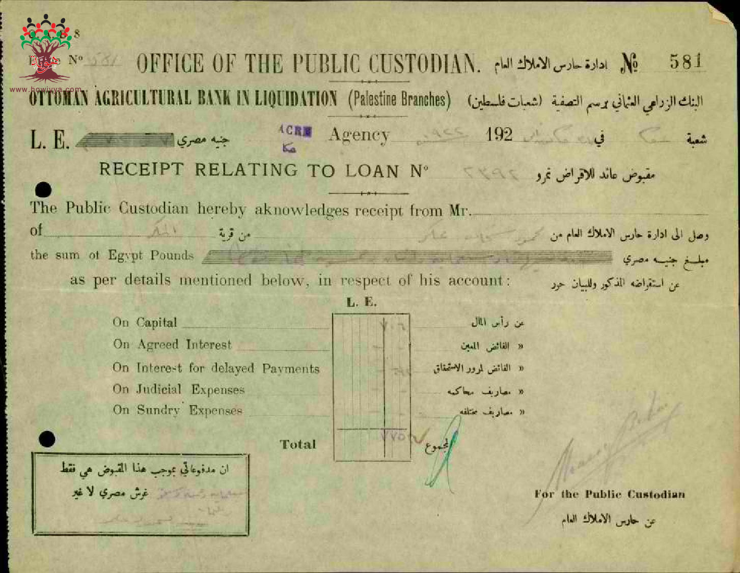 إيصال دفع قسط قرض للبنك الزراعي العثماني موقع من محمد شحادة عكر
