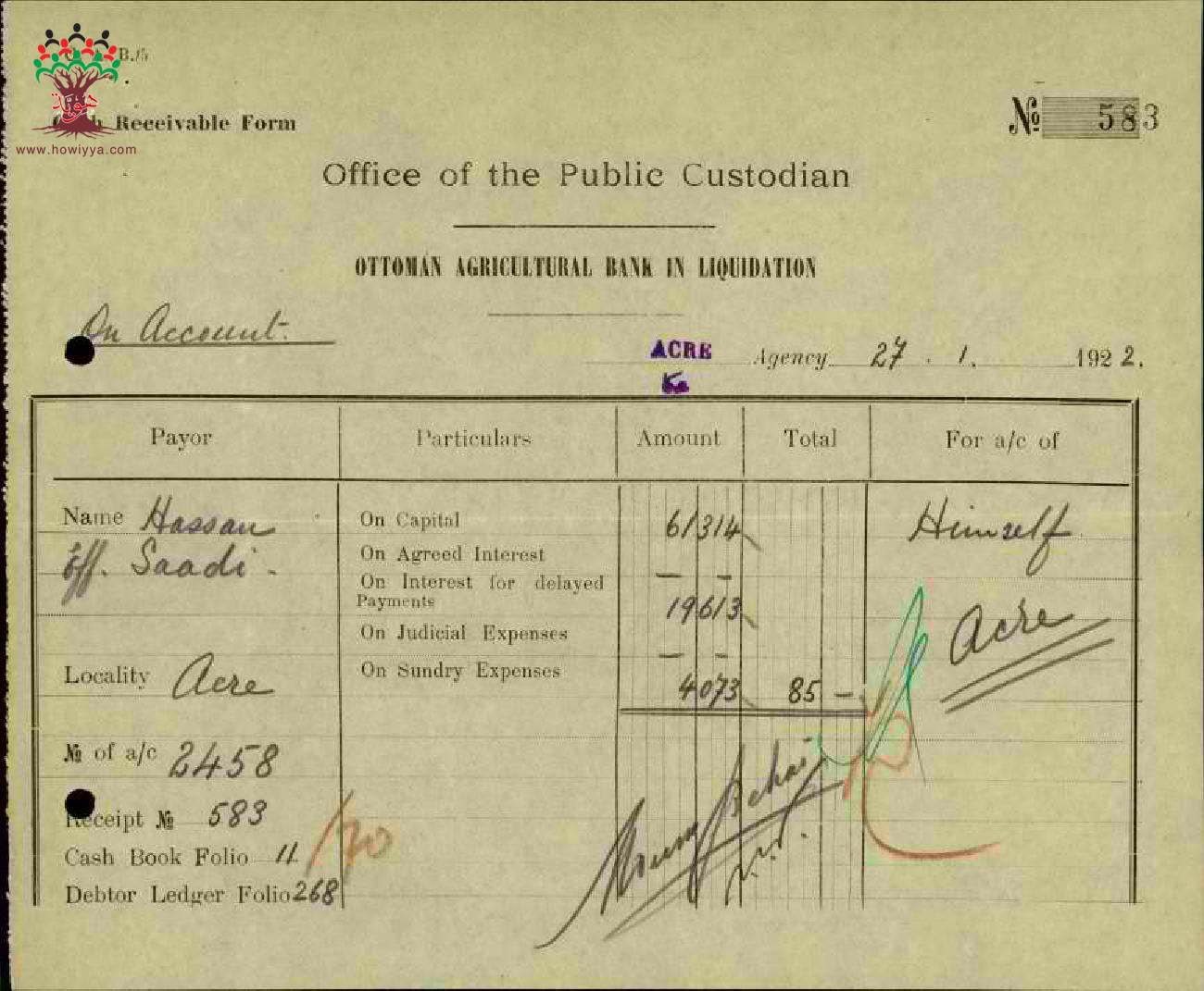 إيصال دفع قسط قرض للبنك الزراعي العثماني موقع من خضرة حسن السعدي