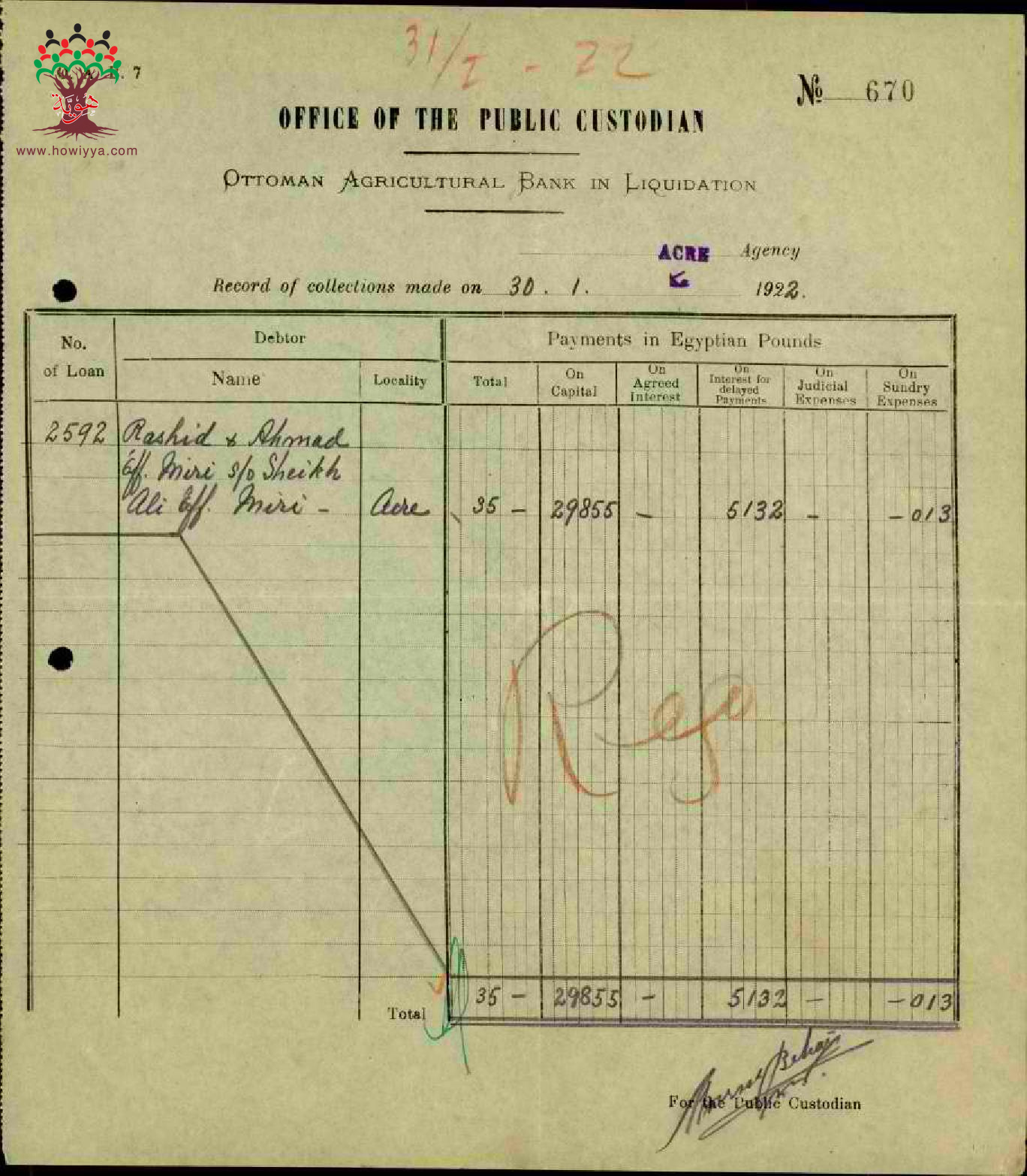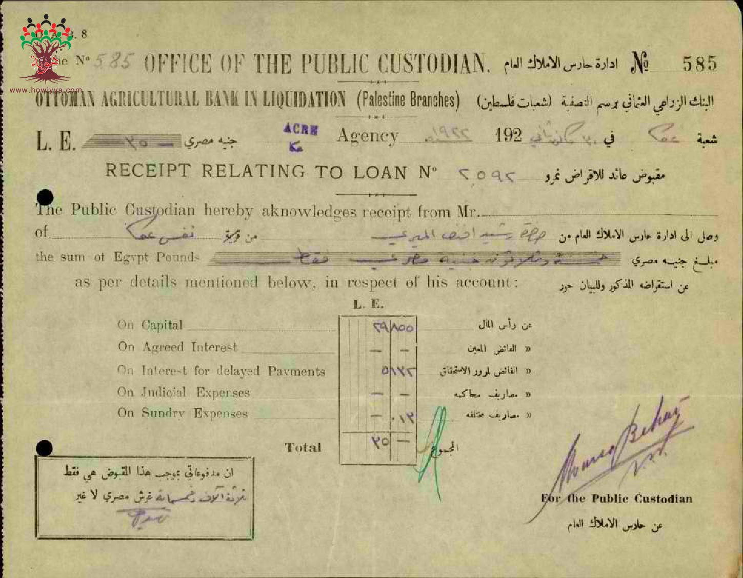 إيصال دفع قسط قرض للبنك الزراعي العثماني موقع من رشيد الميري