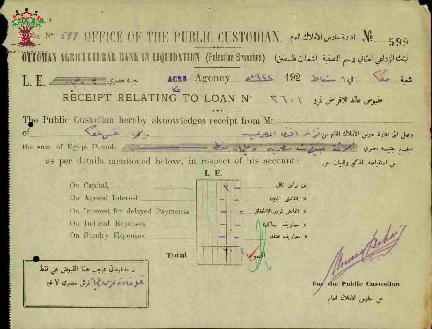 إيصال دفع قسط قرض للبنك الزراعي العثماني موقع من فؤاد المصري
