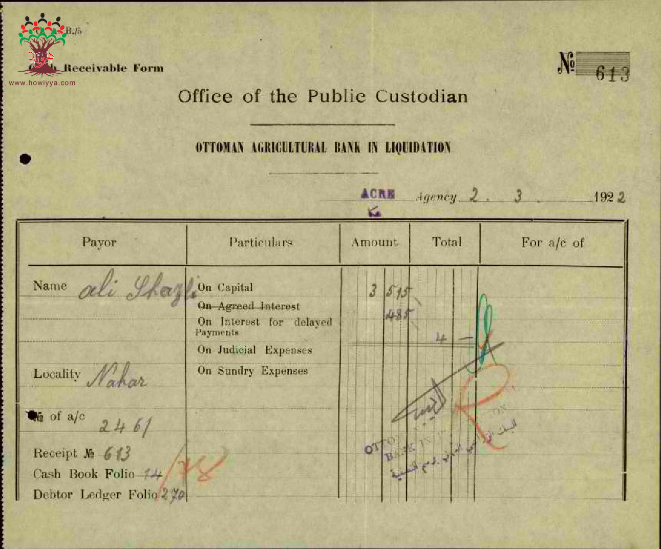 إيصال دفع قسط قرض للبنك الزراعي العثماني موقع من علي الشاذلي