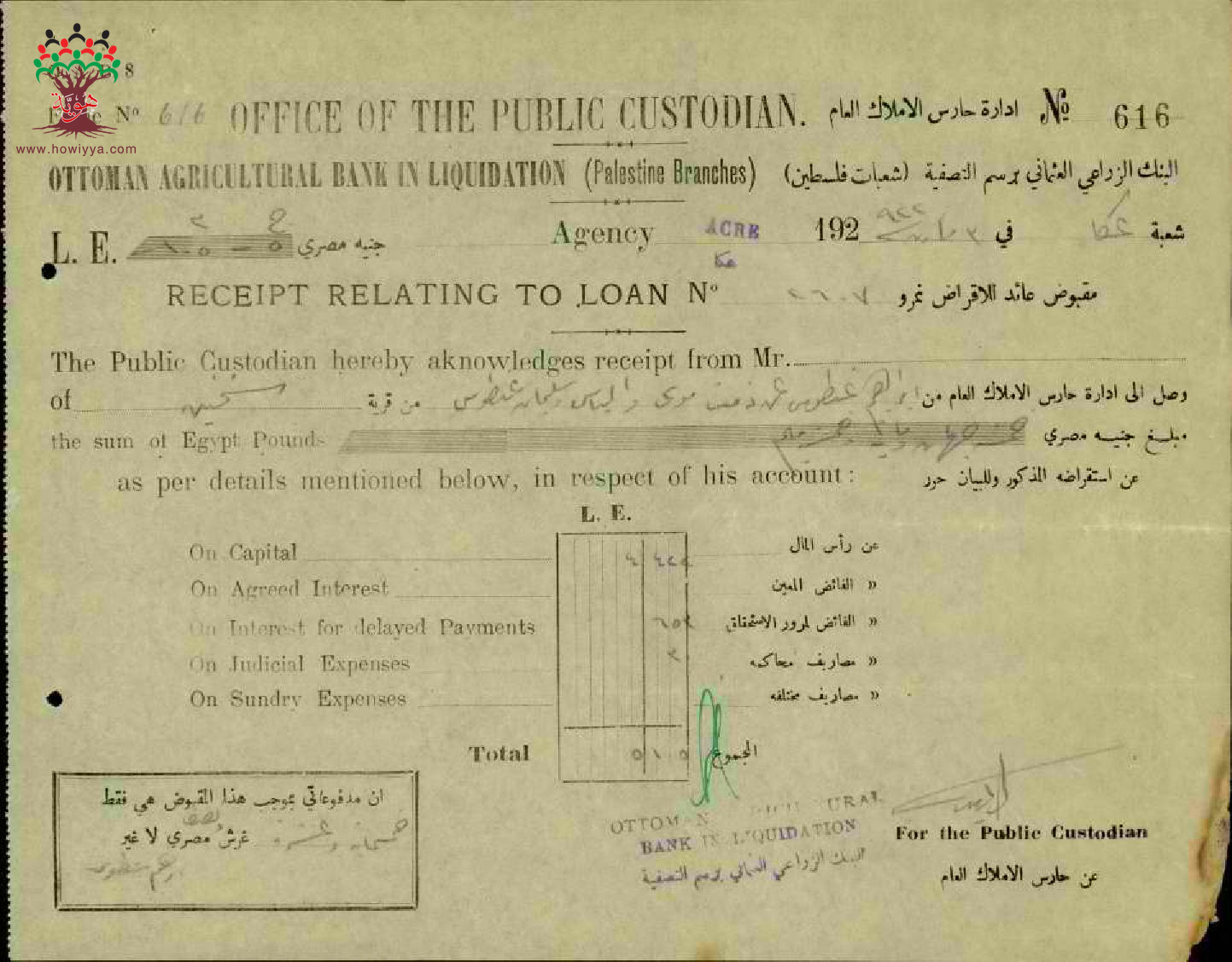 إيصال دفع قسط قرض للبنك الزراعي العثماني موقع من ابراهيم غنطوس