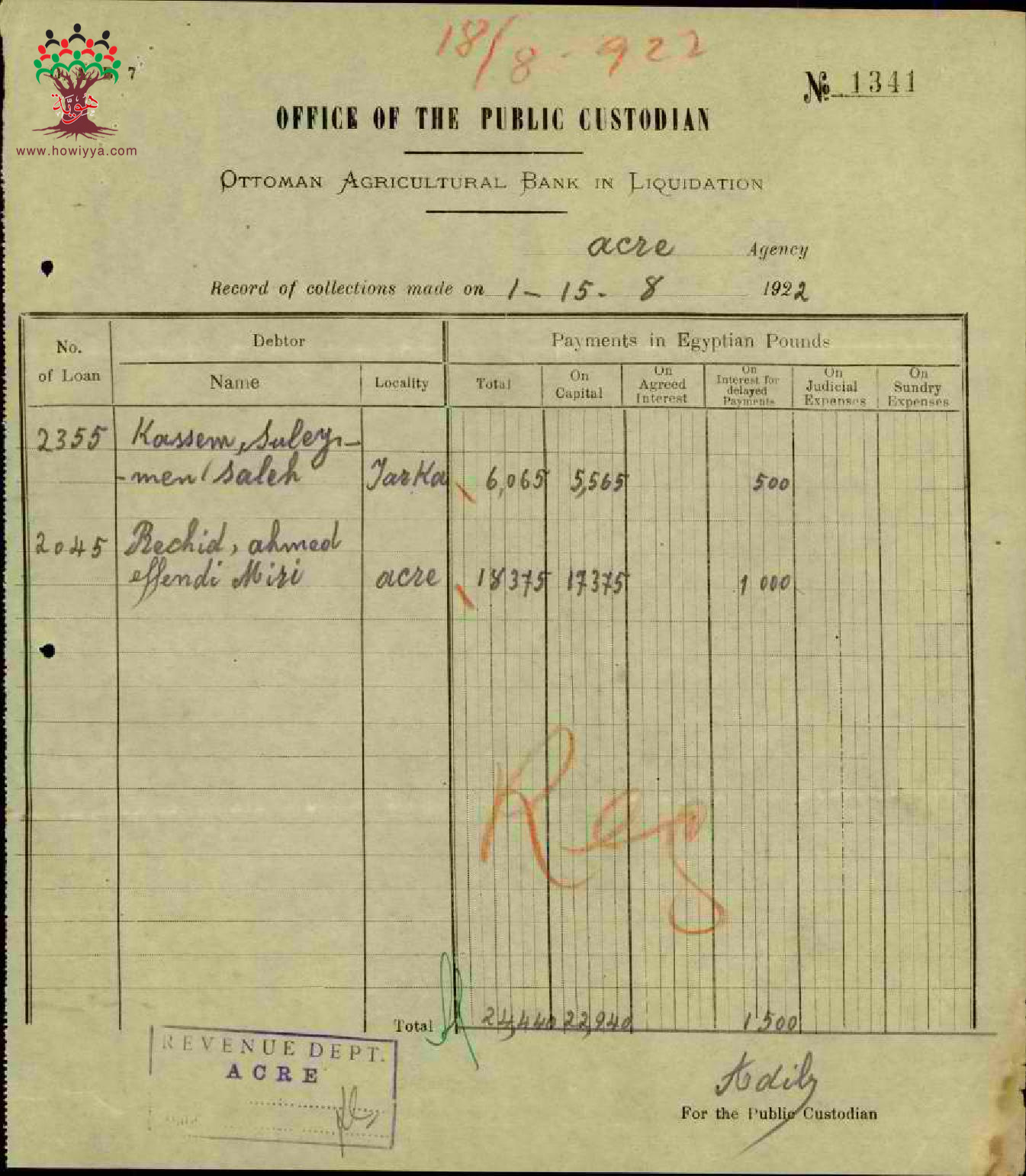 إيصال دفع قسط قرض للبنك الزراعي العثماني موقع من قاسم صالح و رشيد وأحمد ميري