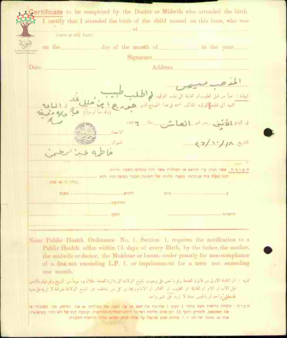 شهادة تبليغ ولادة - جورج خليل نخلة النابلسي أمه زهية مارون
