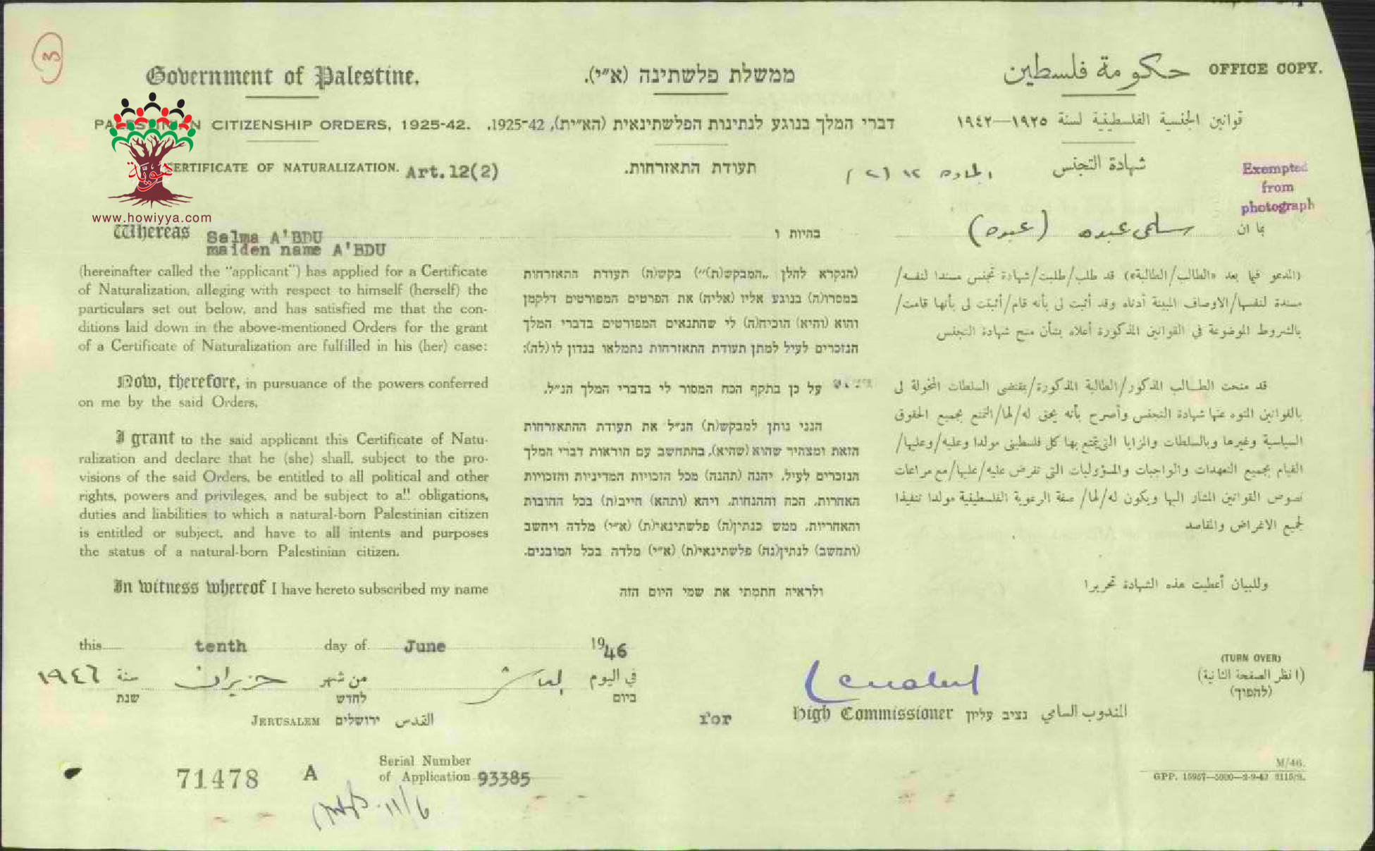 شهادة الجنسية الفلسطينية ل سلمى عبده
