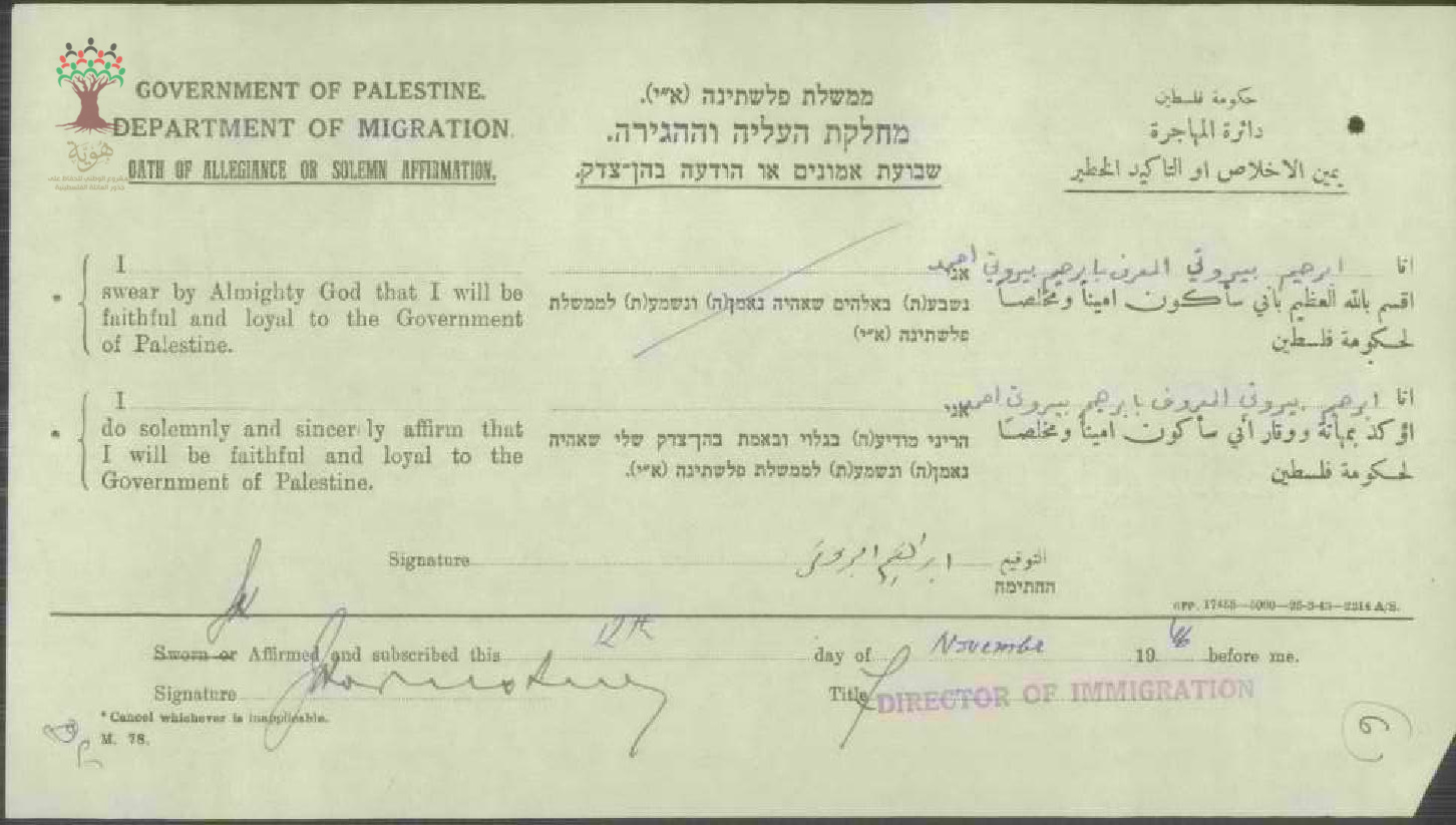 ابراهيم بيروتي المعروف ابراهم بيروتي أحمد يوقع على (يمين الإخلاص) للحصول على الجنسية الفلسطينية