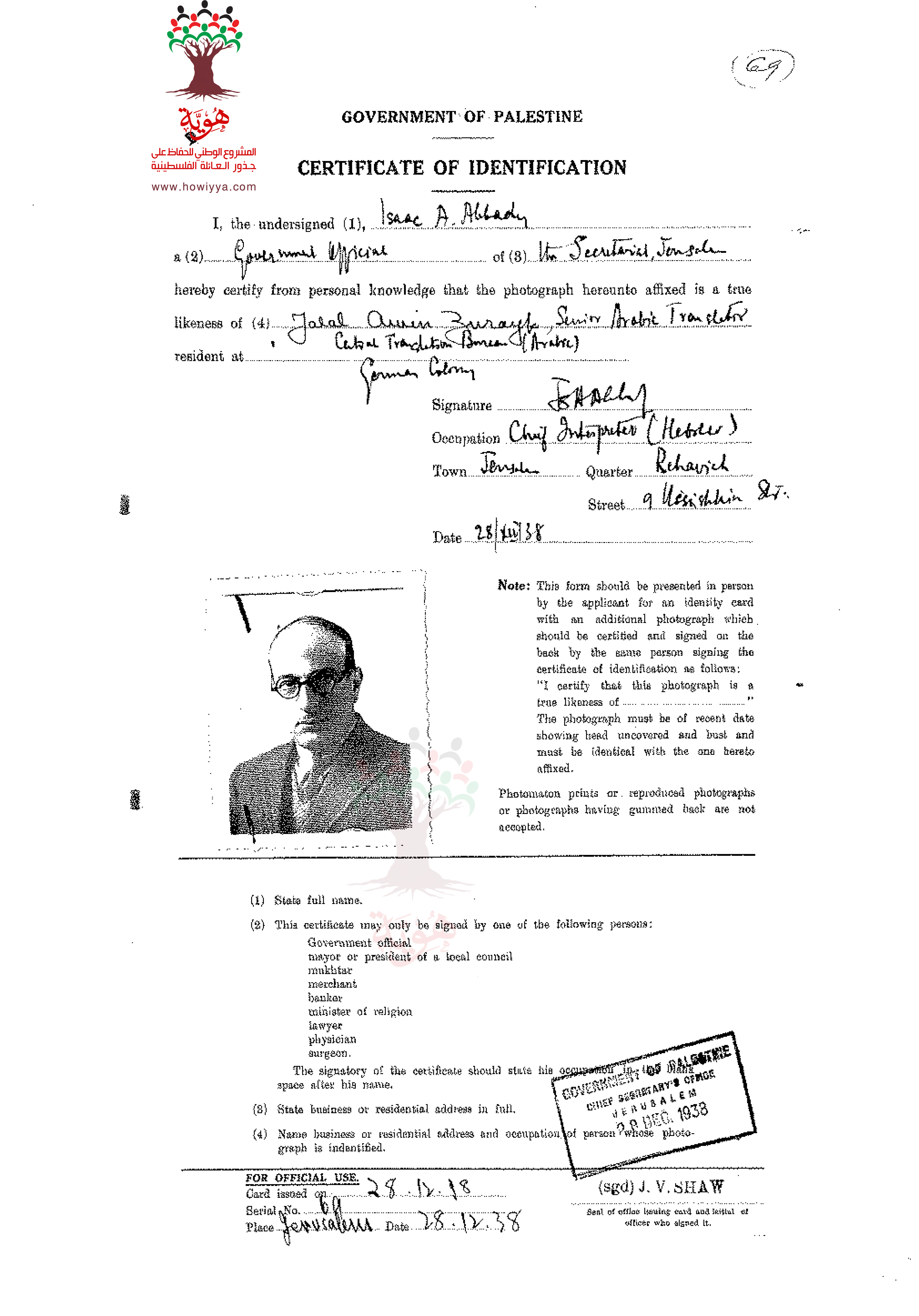 شهادة هوية جلال أمين زريق وكان يقيم في القدس ويعمل في مكتب الترجمة