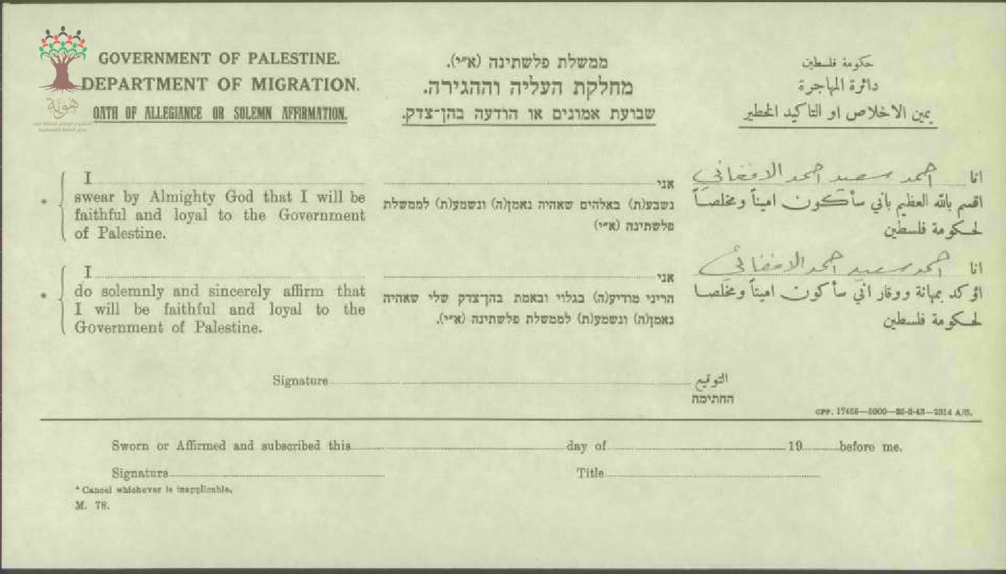 أحمد سعيد الأفغاني يوقع على(يمين الاخلاص) للحصول على الجنسية الفلسطينية