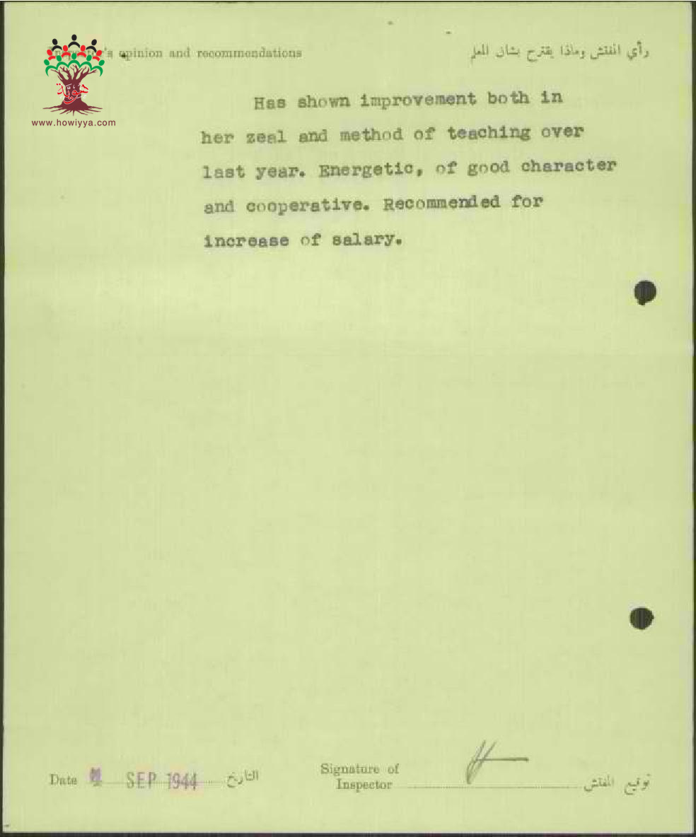 تقرير تفصيلي عن أداء المعلمة اوليفيا بندلي عدس في مدرسة عكا سنة 1944