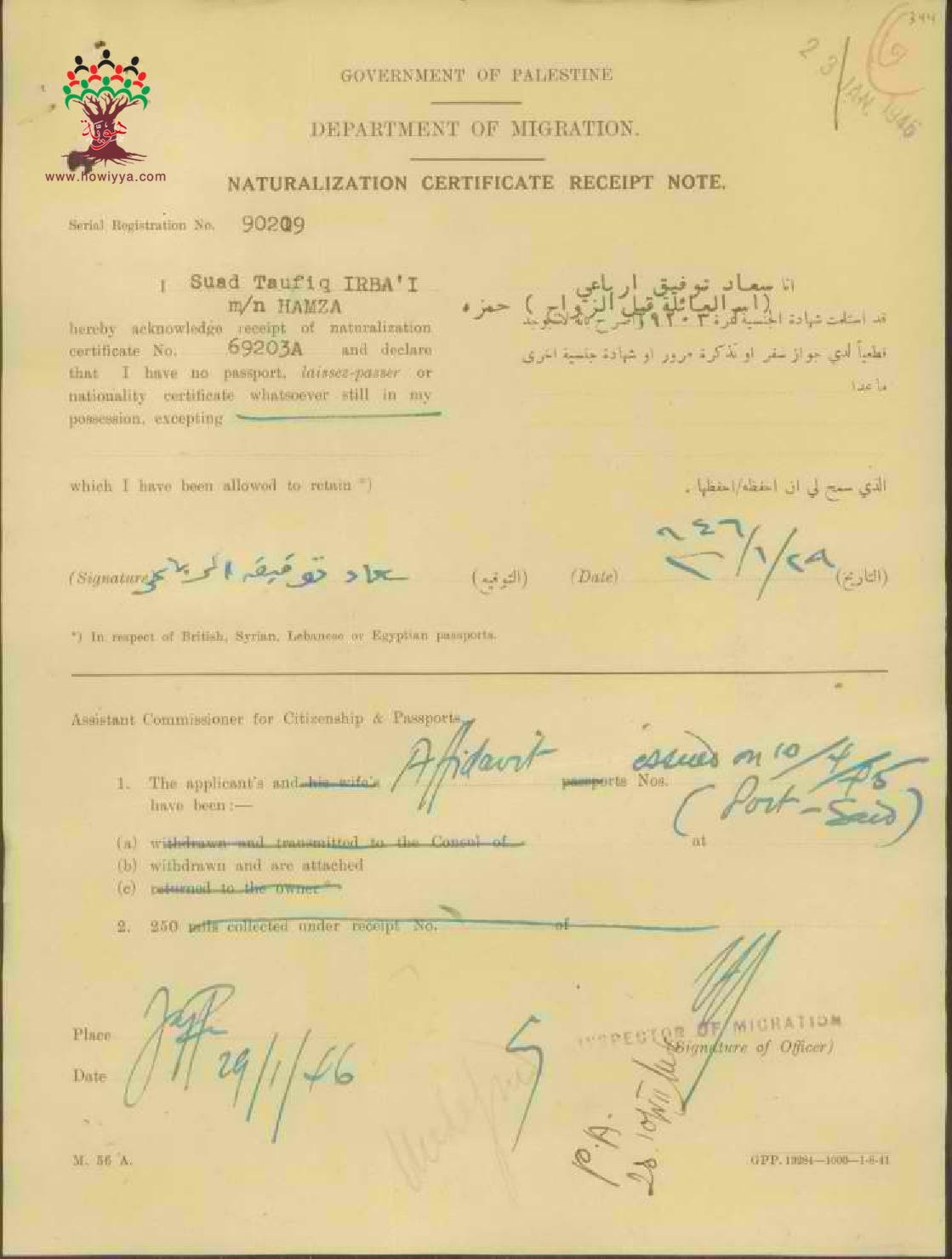 إيصال موقع من سعاد رباعي باستلام شهادة الجنسية الفلسطينية