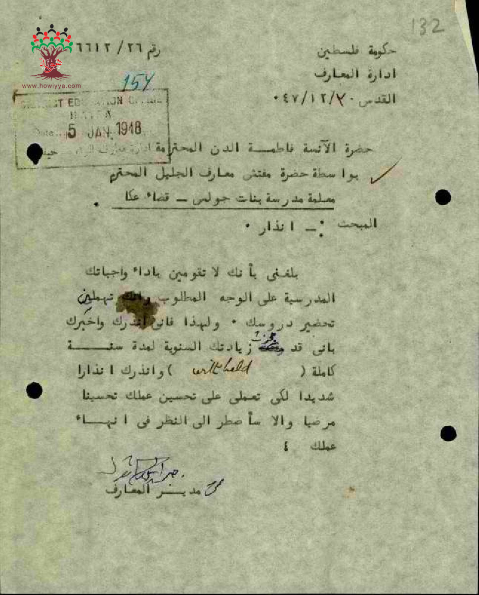 انذار موجه الى المعلمة فاطمة الدن بسبب أدائها الغير مرضي