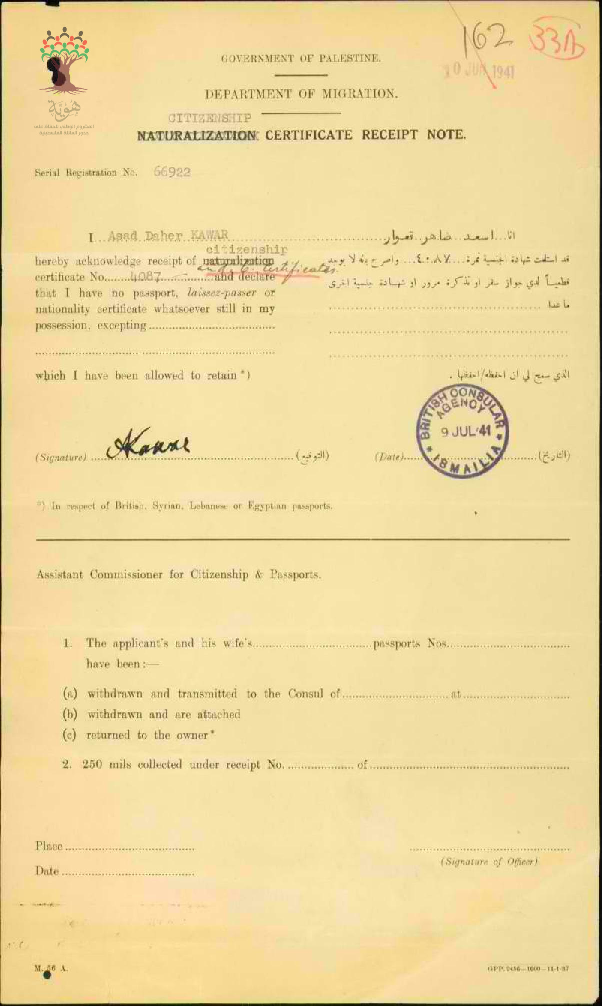 ايصال موقع من أسعد ضاهر قعوار باستلام شهادة الجنسية الفلسطينية