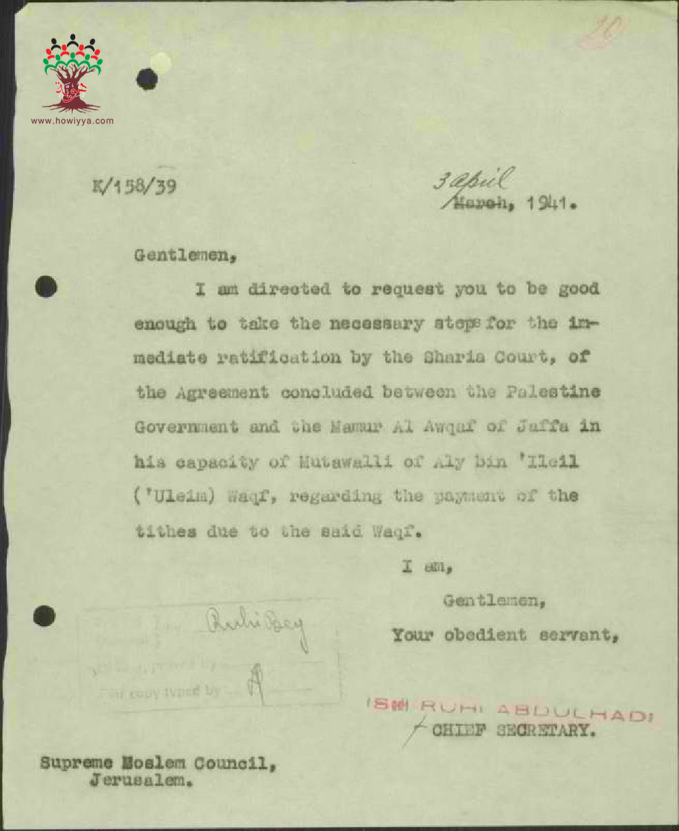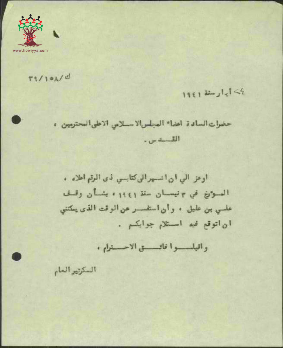 مجموعة رسائل من السكرتير العام الى المجلس الاسلامي الأعلى بخصوص الاتفاق حول وقف علي بن عليل ودفع المستحقات للأوقاف