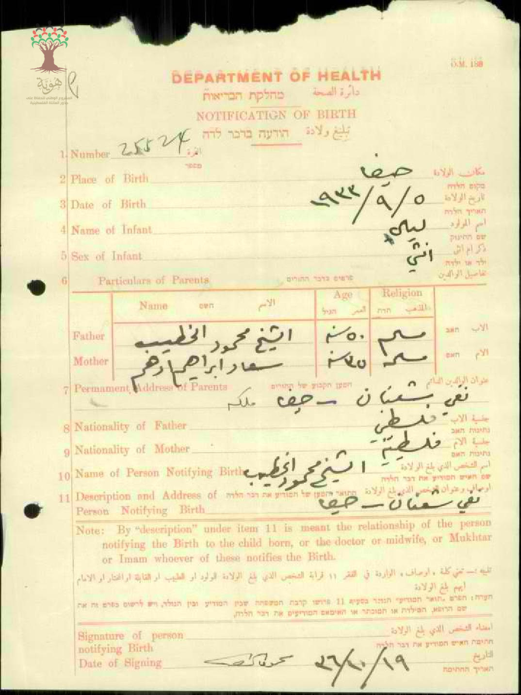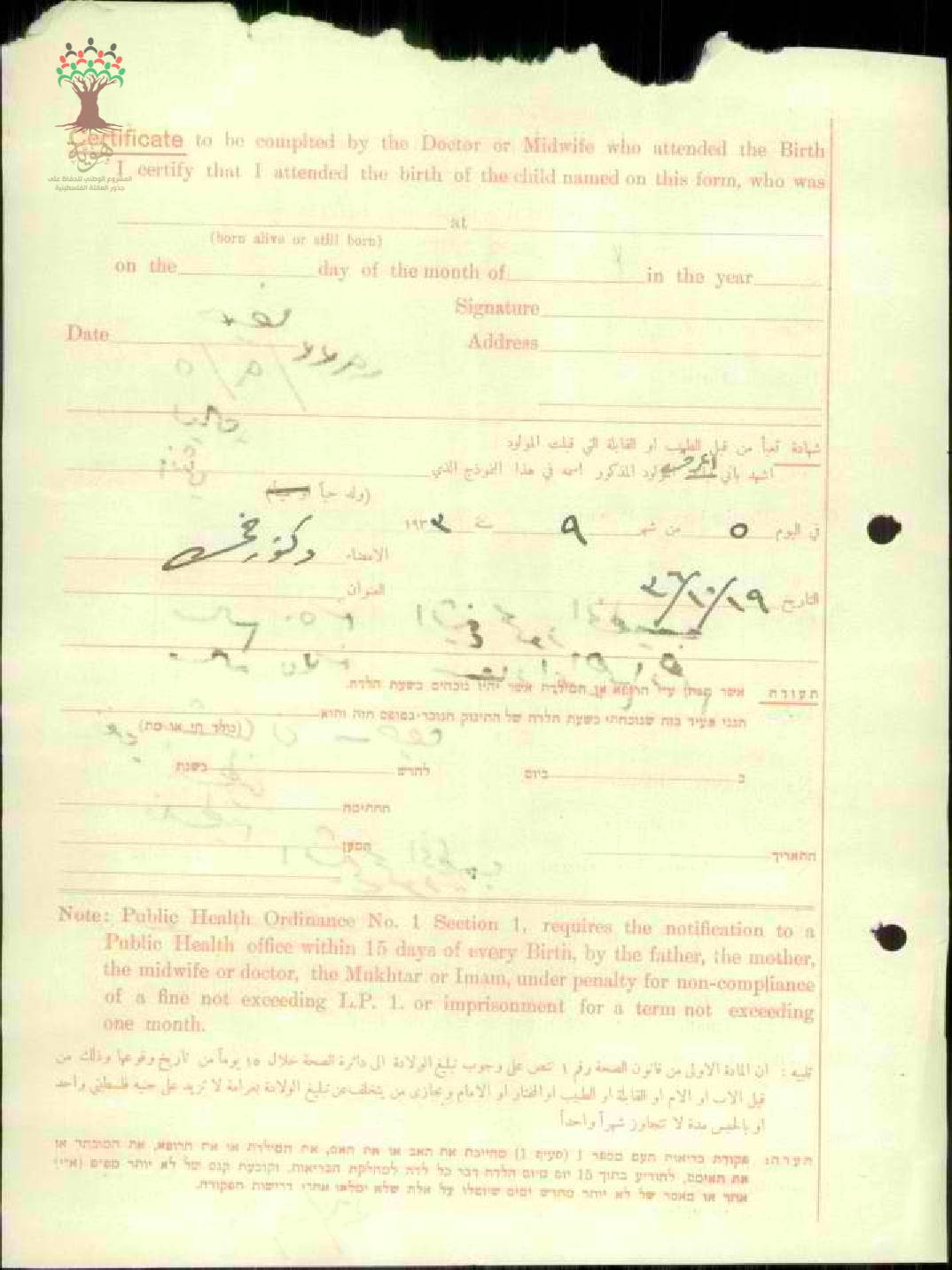 شهادة تبليغ ولادة-ليلى الشيخ محمود الخطيب و أمها سعاد إبراهيم أدهم