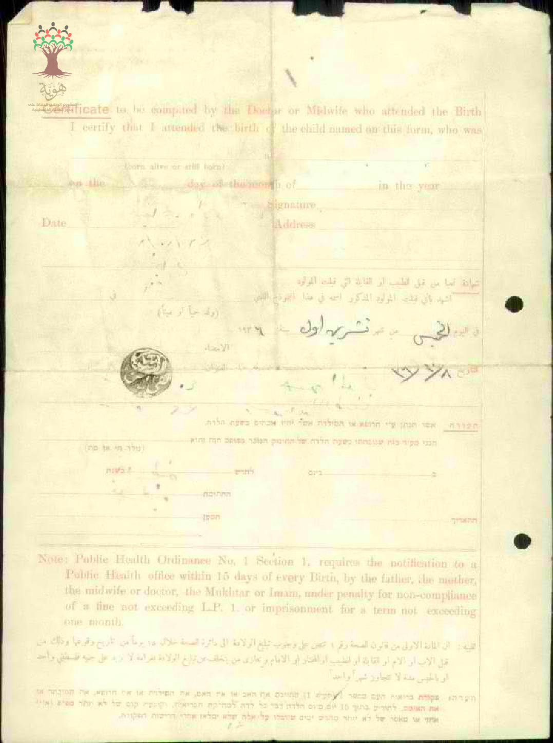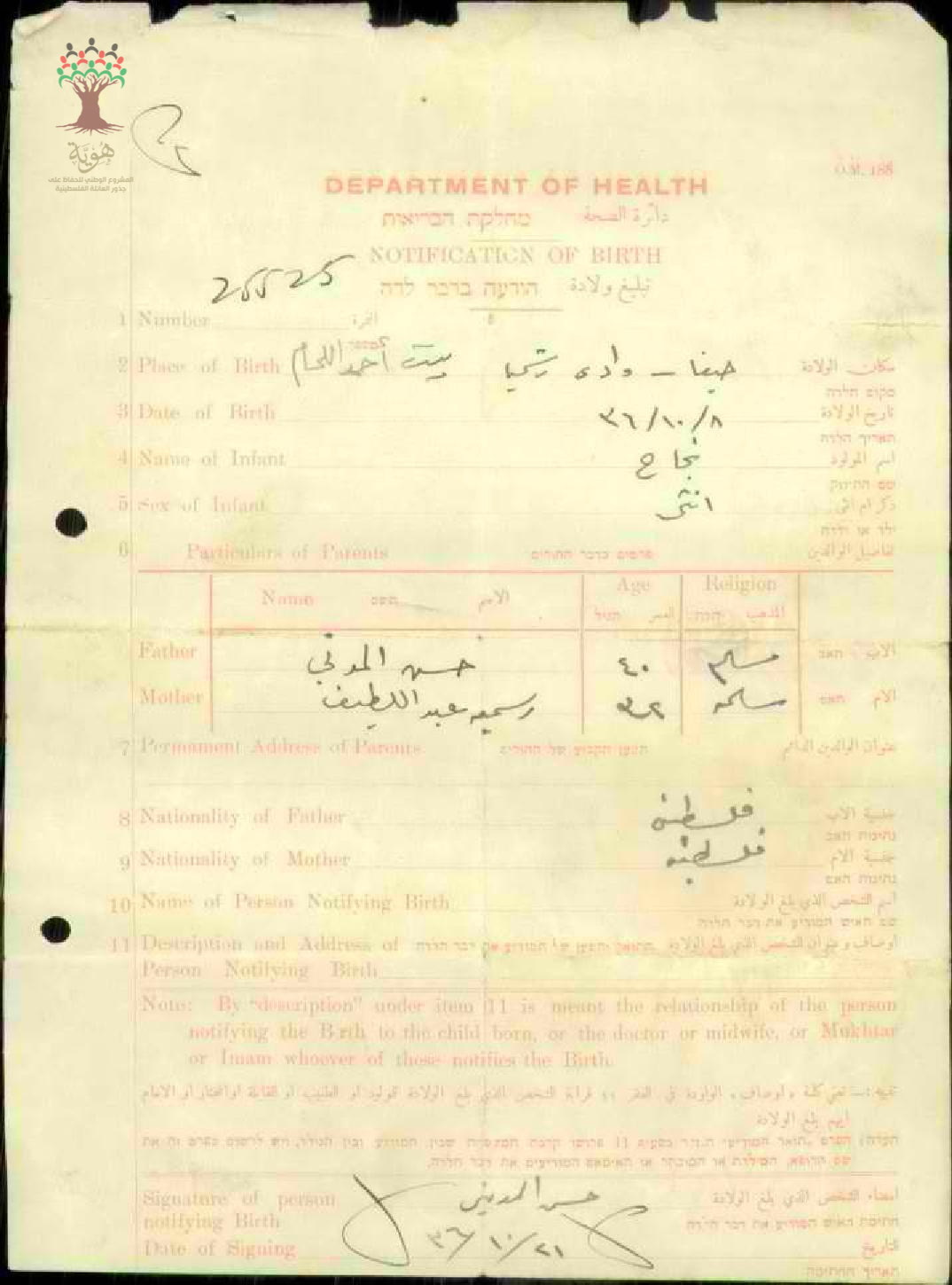 شهادة تبليغ ولادة- نجاح حسن المدني و أمها رسمية عبد اللطيف