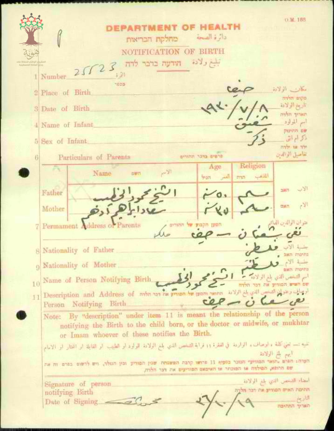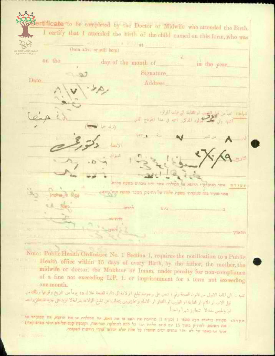 شهادة تبليغ ولادة- شفيق الشيخ محمود الخطيب و أمه سعاد إبراهيم أدهم