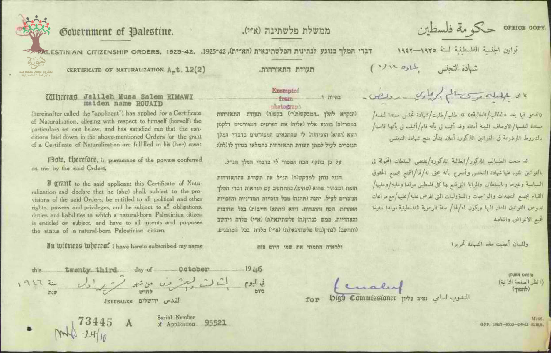 شهادة الجنسية الفلسطينية لجليلة الريماوي
