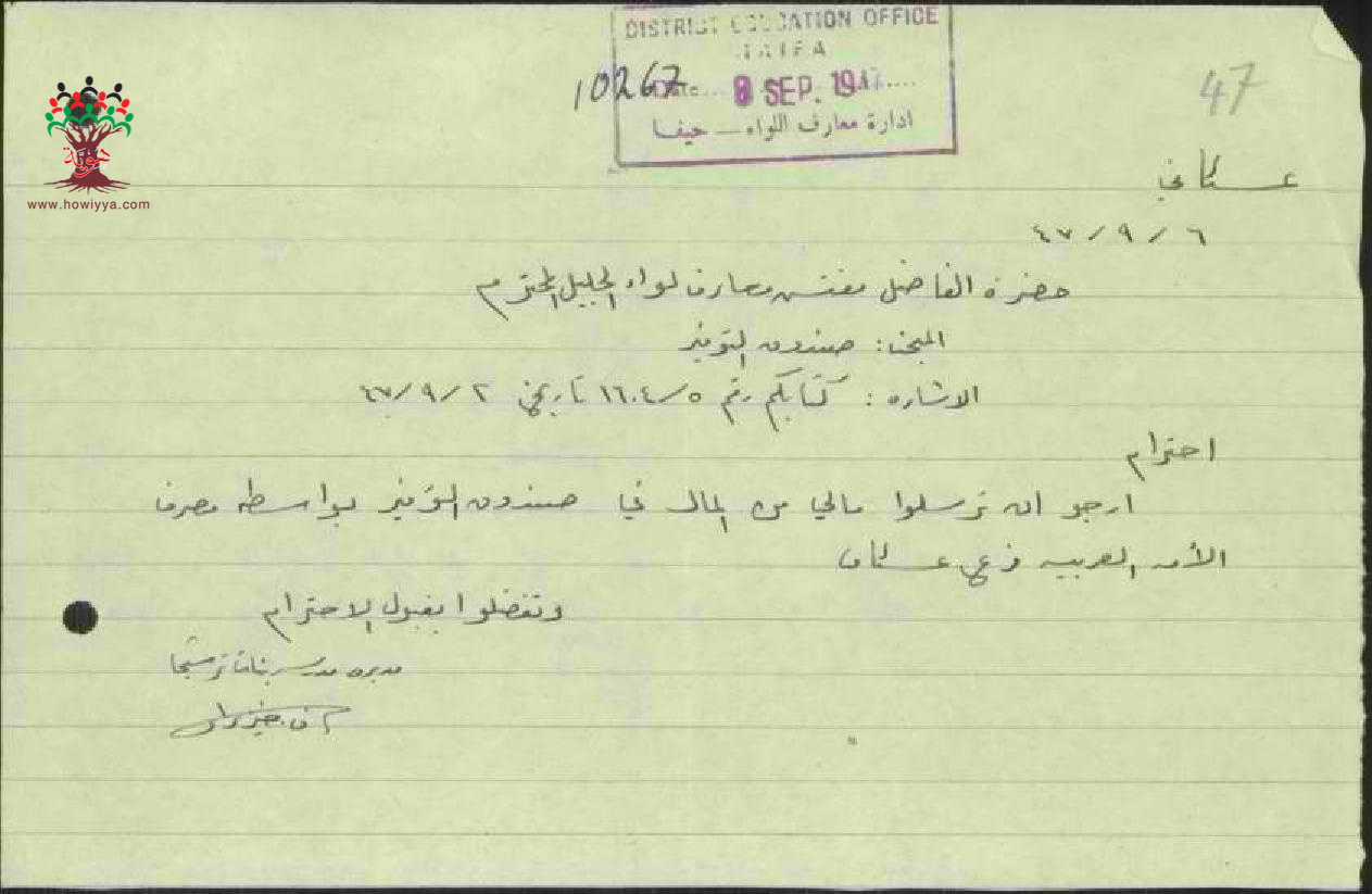 رسائل من المعلمة فاطمة خيزران الى ادارة المعارف بخصوص الحصول على راتبها من صندوق التوفير