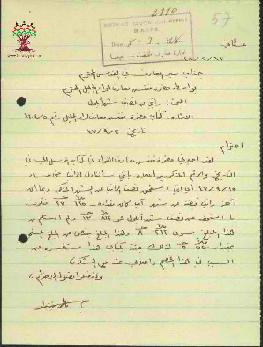 رسالة من مفتش المعارف الى مدير المعارف مرفقة برسالة من المعلمة فاطمة خيزران تطلب فيها راتبها بعد الاستقالة