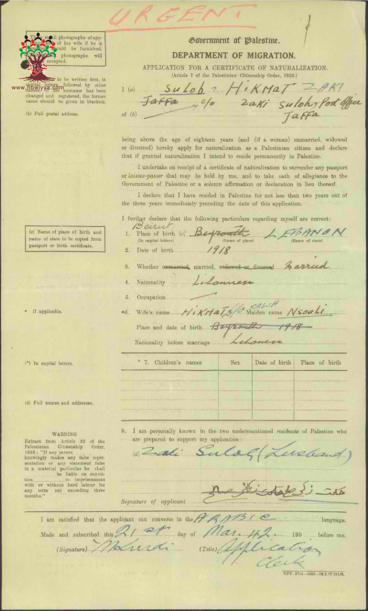 طلب الجنسية الفلسطينية-حكمت النصولي صلح-يافا/لبنان
