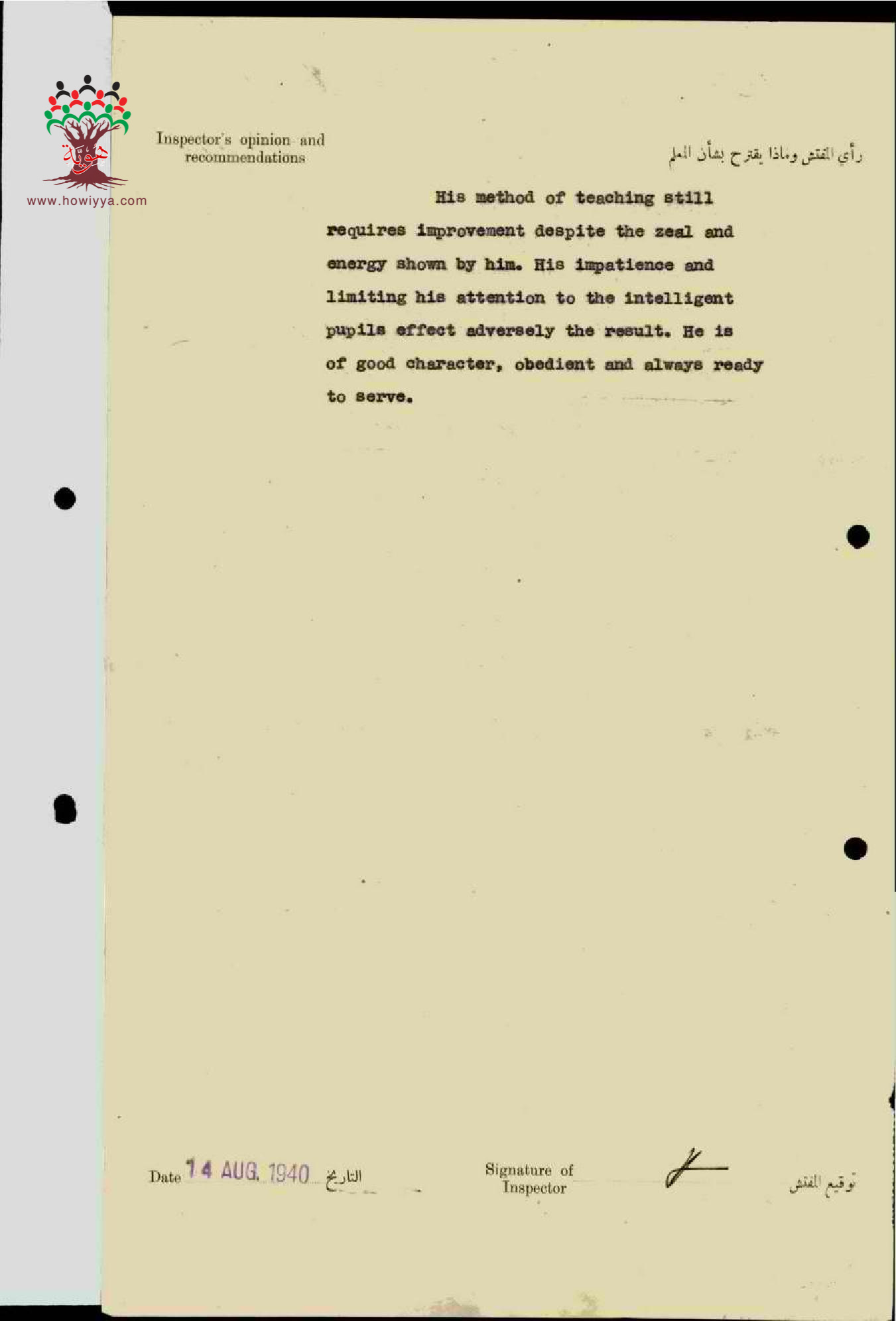تقرير تفصيلي عن أداء المعلم راجي صهيون في مدرسة حيفا سنة 1940