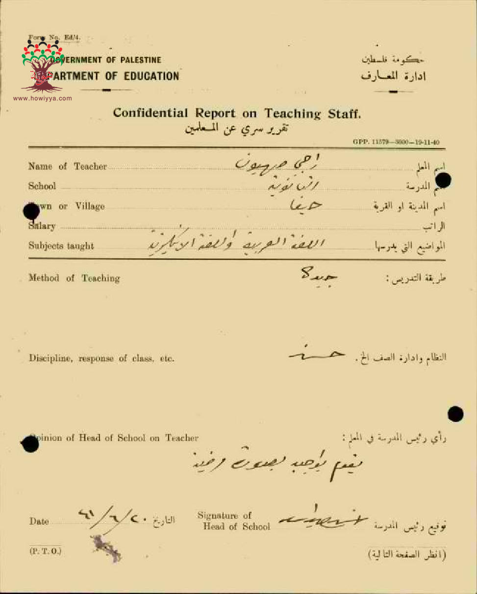 تقرير تفصيلي عن أداء المعلم راجي صهيون في مدرسة حيفا سنة 1941