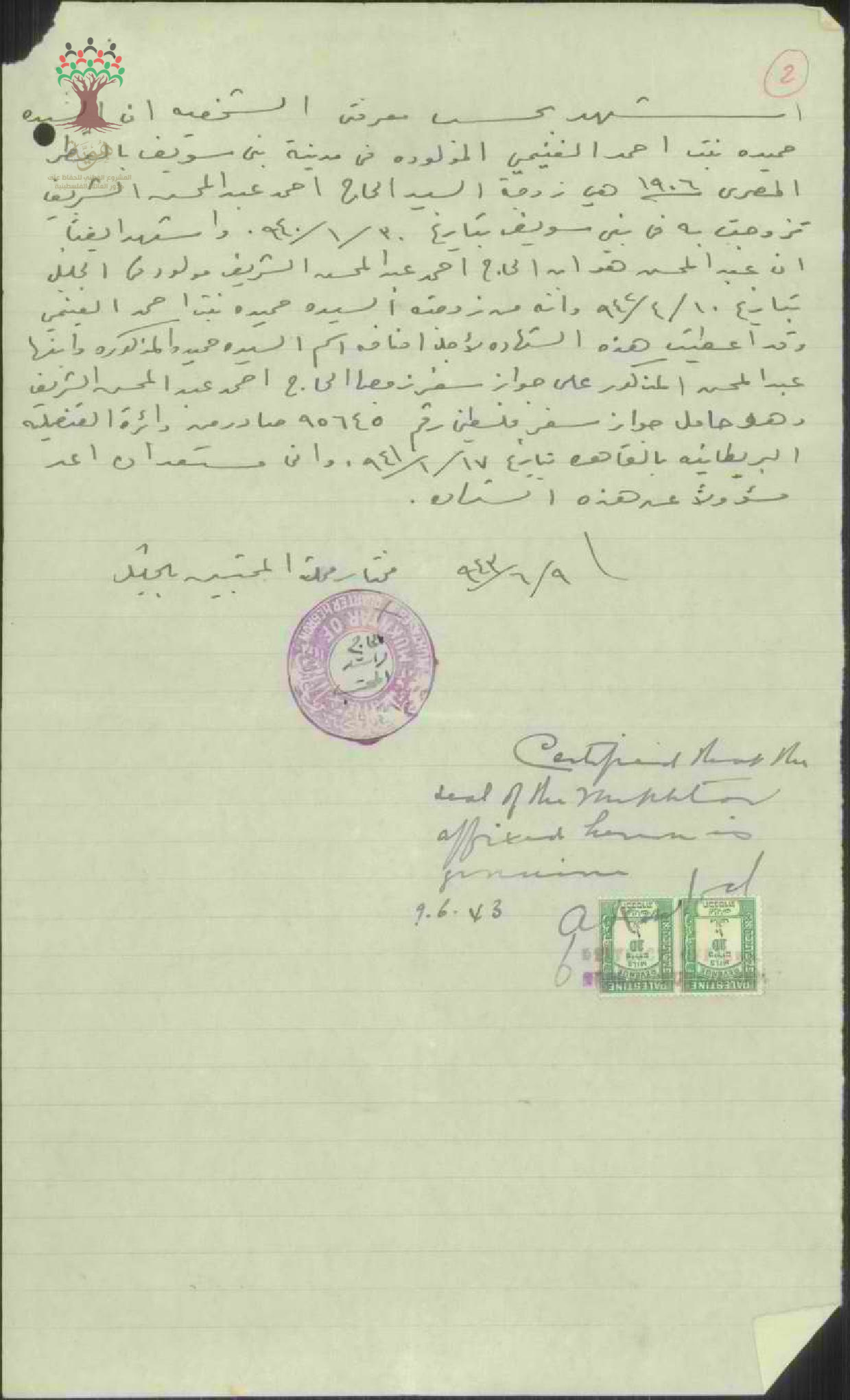 شهادة من المختار للسيدة حميدة الغنيمي (شريف) زوجة الحاج احمد عبد الحميد الشريف بخصوص طلب الجنسية/الخليل