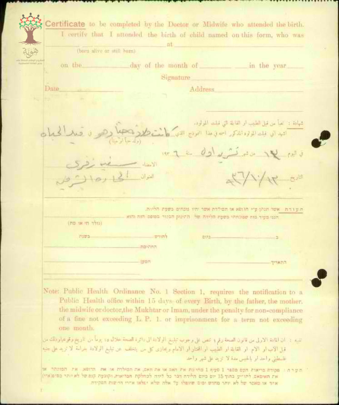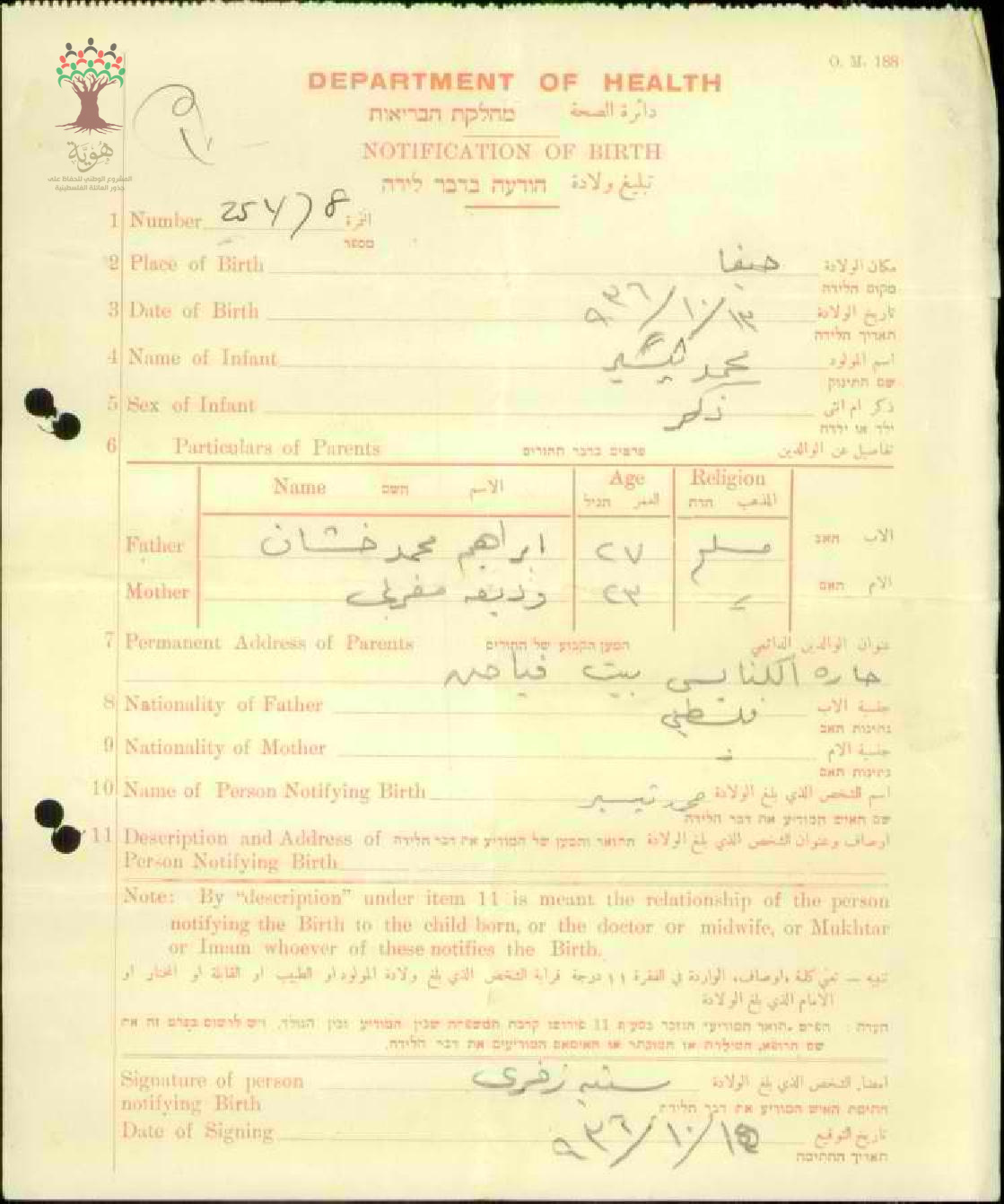 شهادة تبليغ ولادة- محمد تيسير إبراهيم محمد خشان و أمه وديعة مغربي