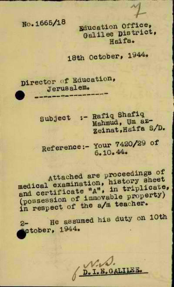 رسالة من مفتش المعارف الى مدير المعارف بخصوص أوراق تعيين المعلم رفيق محمود