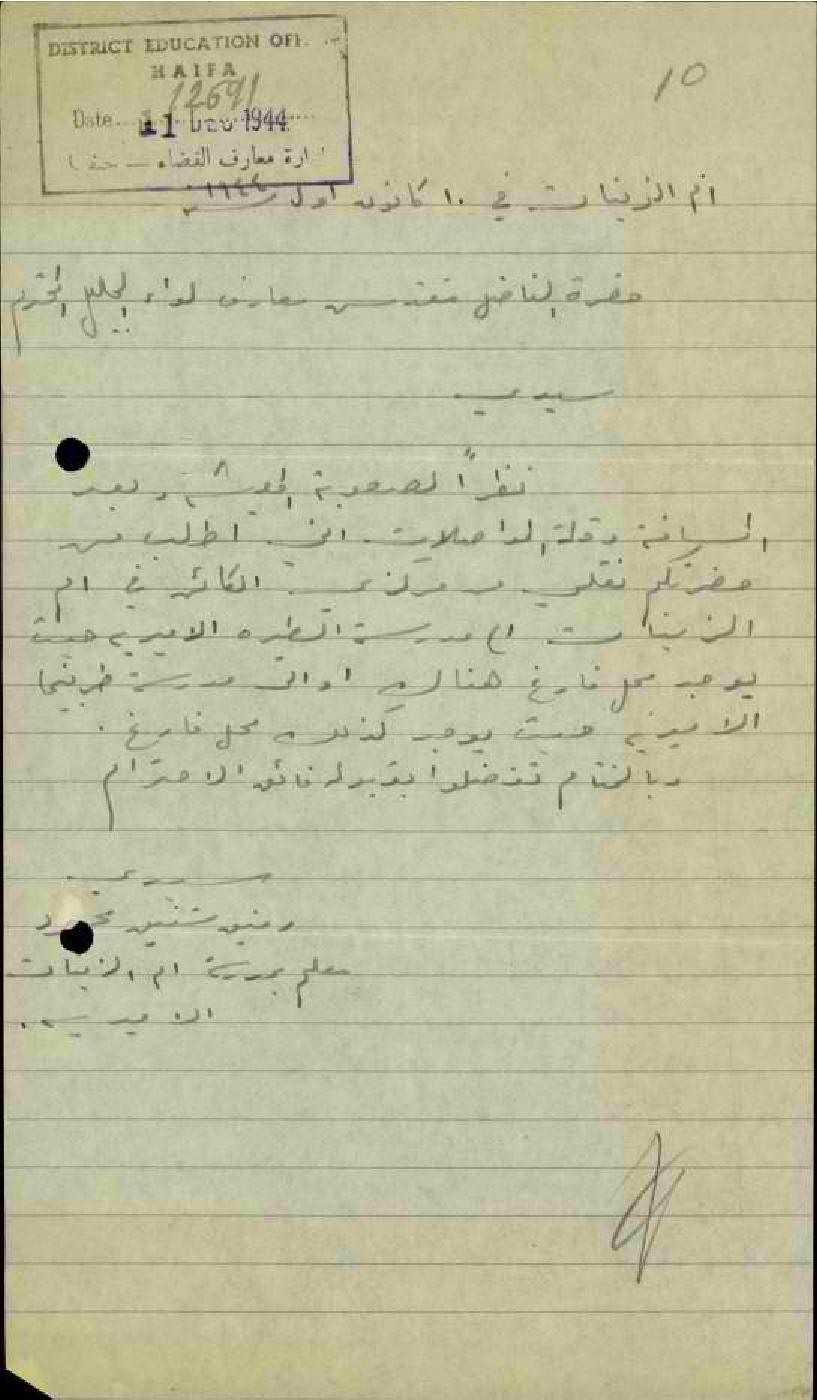 رسالة من المعلم رفيق شفيق محمود الى مفتش المعارف يطلب فيها نقله من مدرسة ام الزينات الى مدرسة الطيرة
