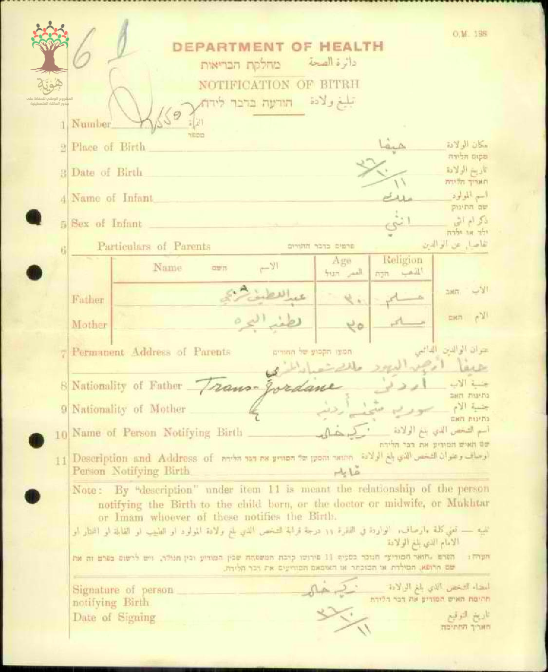 شهادة تبليغ ولادة- ملك عبد اللطيف شربجي