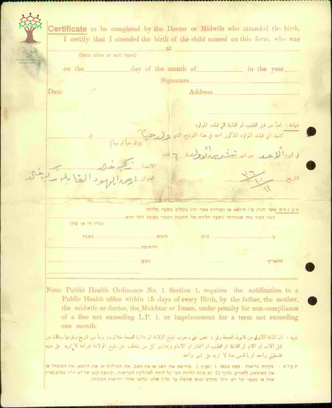 شهادة تبليغ ولادة- ملك عبد اللطيف شربجي و أمها لطفية البحرة