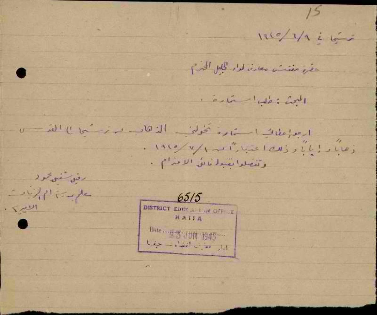 رسالة من المعلم رفيق محمود الى مفتش المعارف يطلب فيها استمارة سفره السنوية