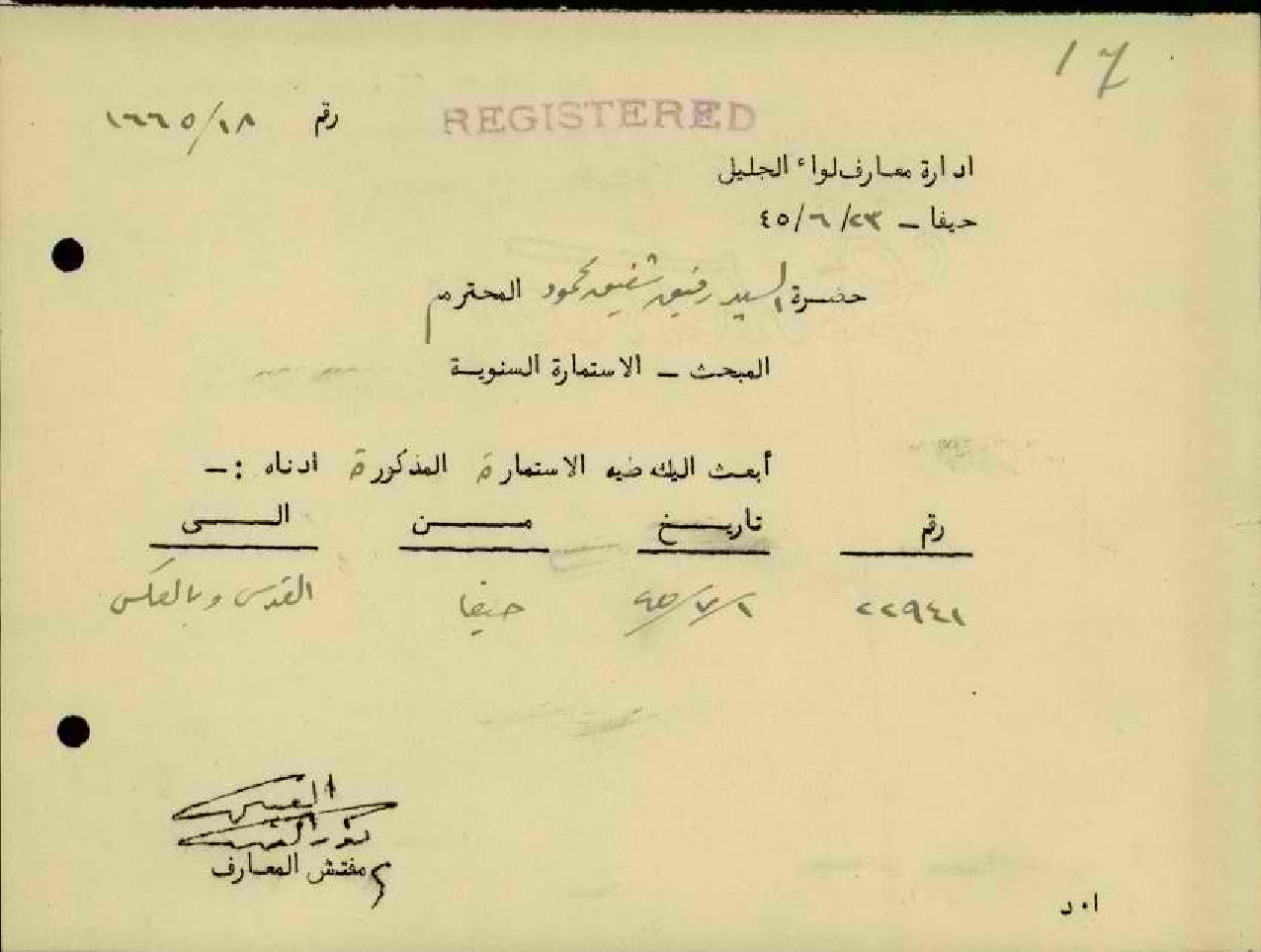 استمارة سفر السنوية للمعلم رفيق شفيق محمود - ترشيحا