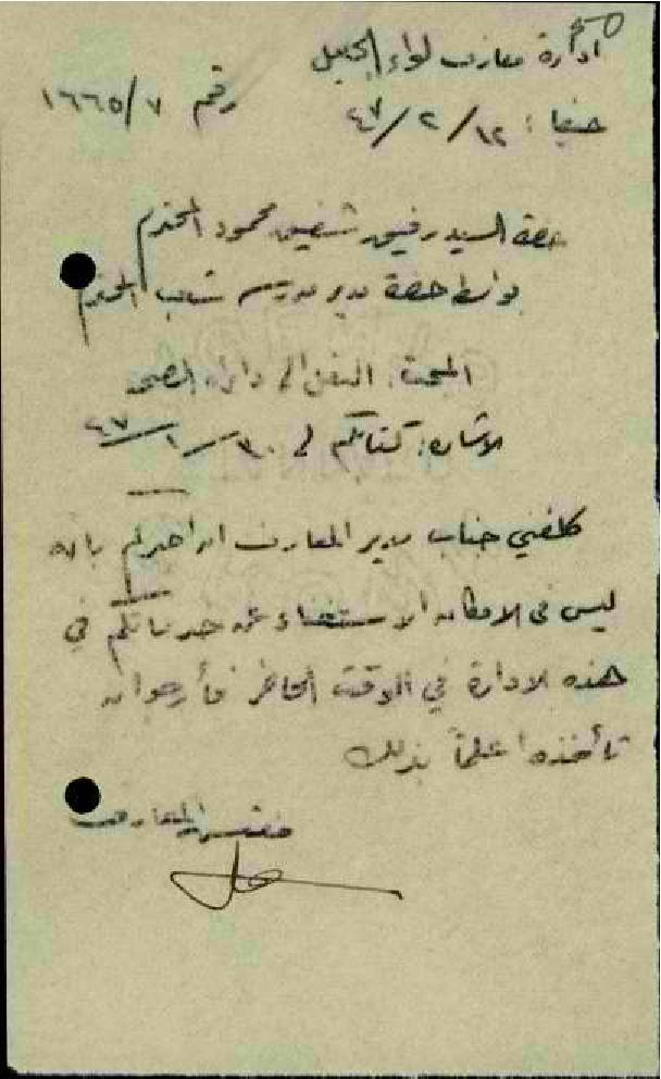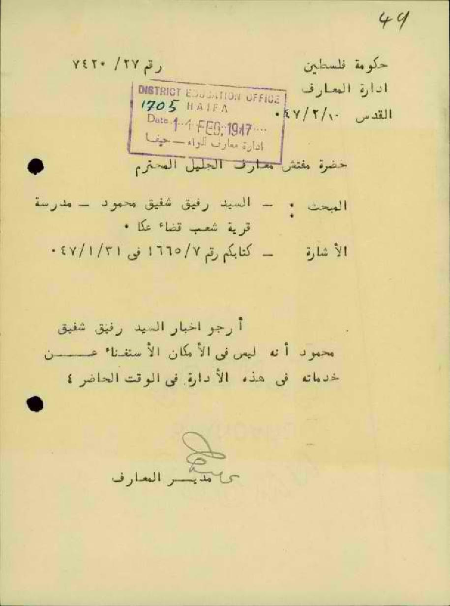 رسائل من ادارة المعارف الى المعلم رفيق محمود بخصوص عدم الموافقة على نقله الى ادارة الصحة