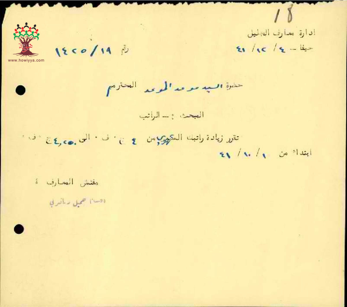 رسالة من مفتش المعارف الى المعلم موعد الموعد بخصوص زيادة راتبه السنوية